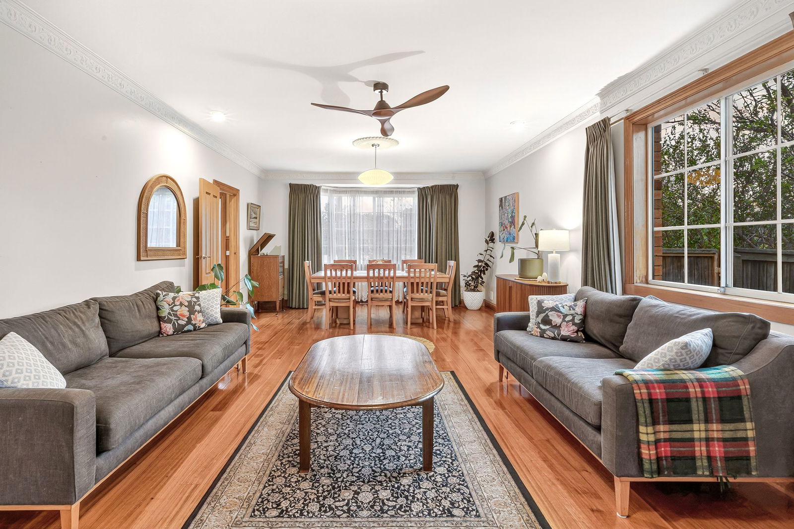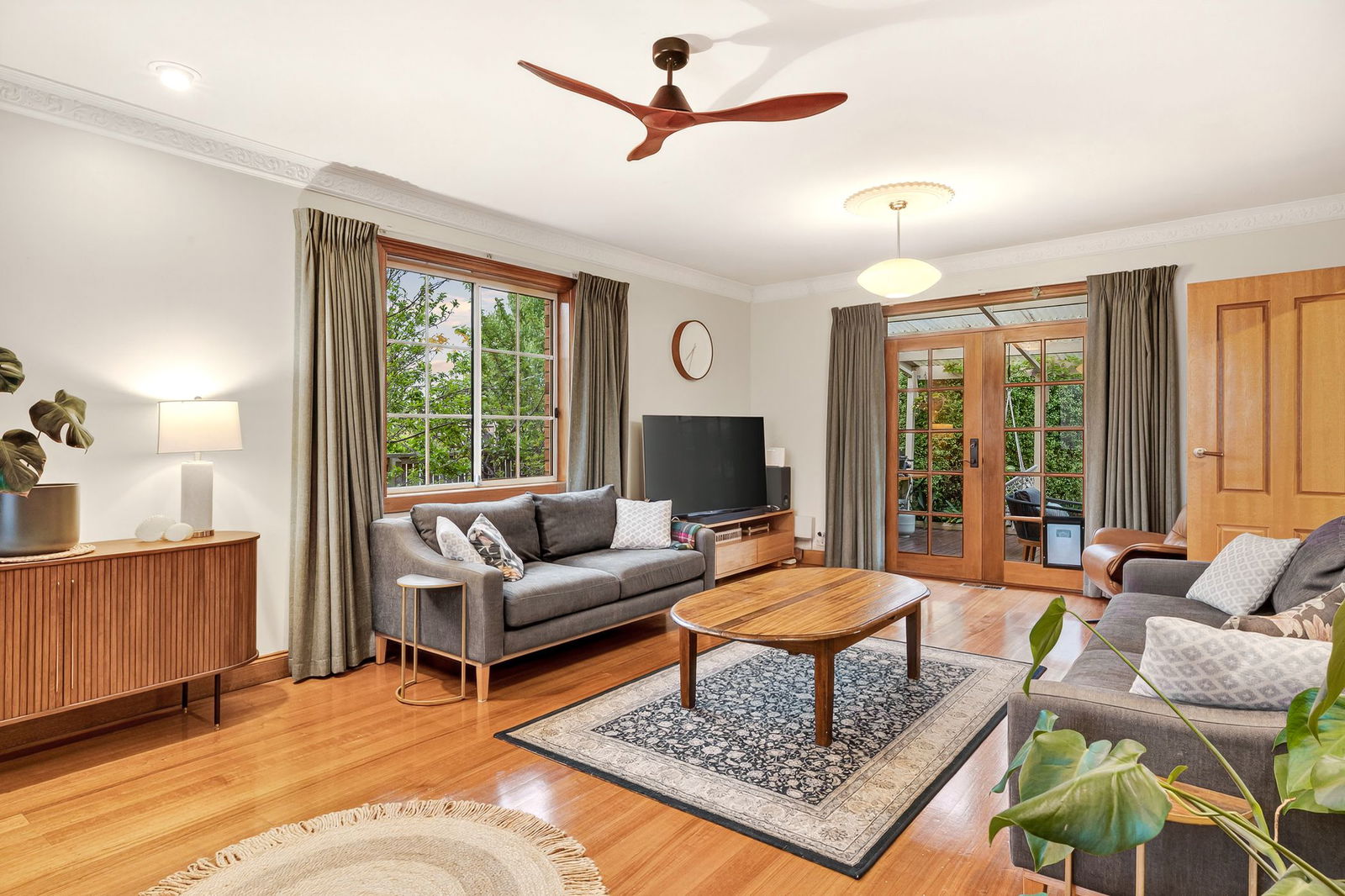 Living/Dining: Solid timber floors, street-facing bay window, decorative cornice, sheer and block-out curtains, central pendant lights, window with block-out curtain, and French doors with direct deck access.