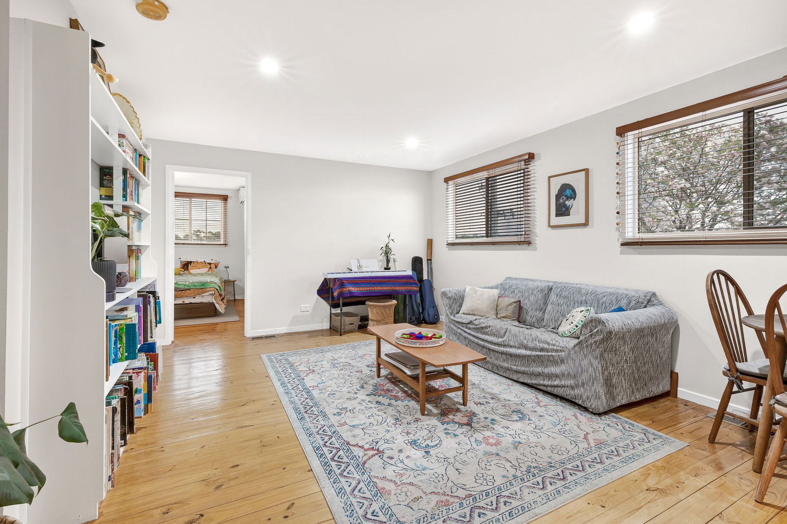 Secondary Lounge: Window with elevated aspects and timber venetian blinds, solid timber floor, and downlights.