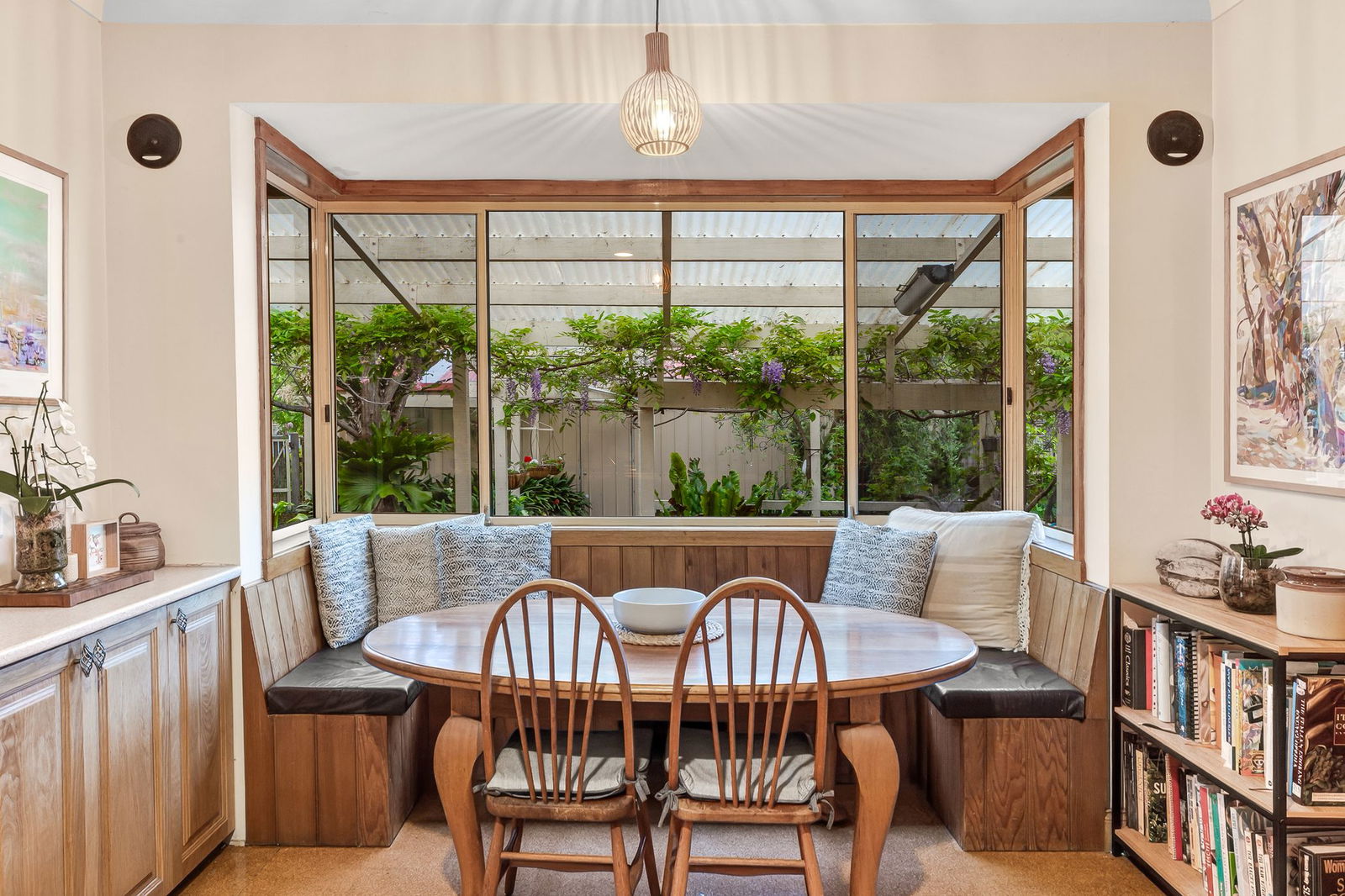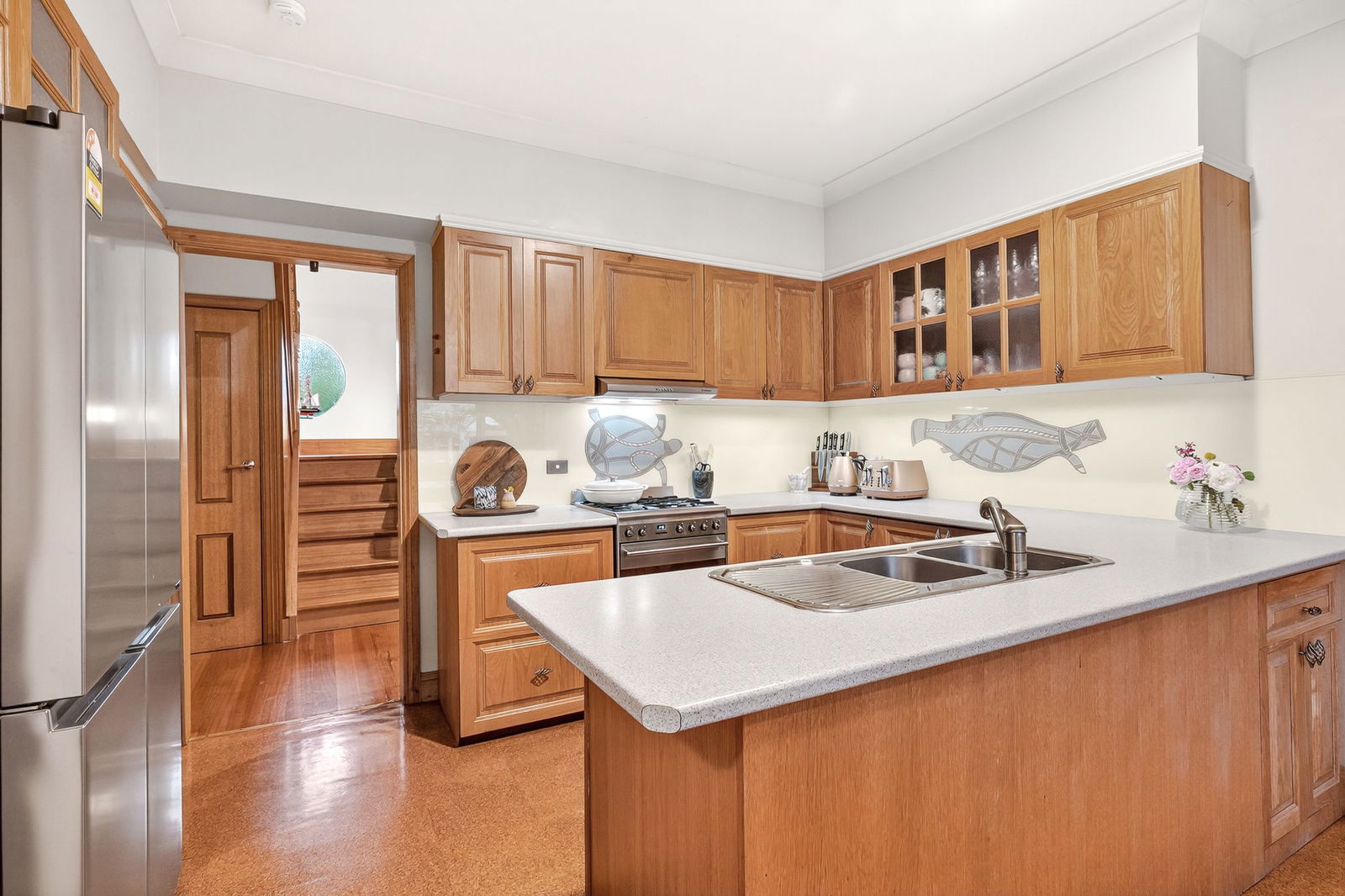 Kitchen: Cork floors, ample bench space, overhead cabinetry, combined oven and gas cooktop, custom splashback, breakfast bar, vertical pantry, fridge cavity, and an orientation towards the adjoining meals area with built-in bench seating.