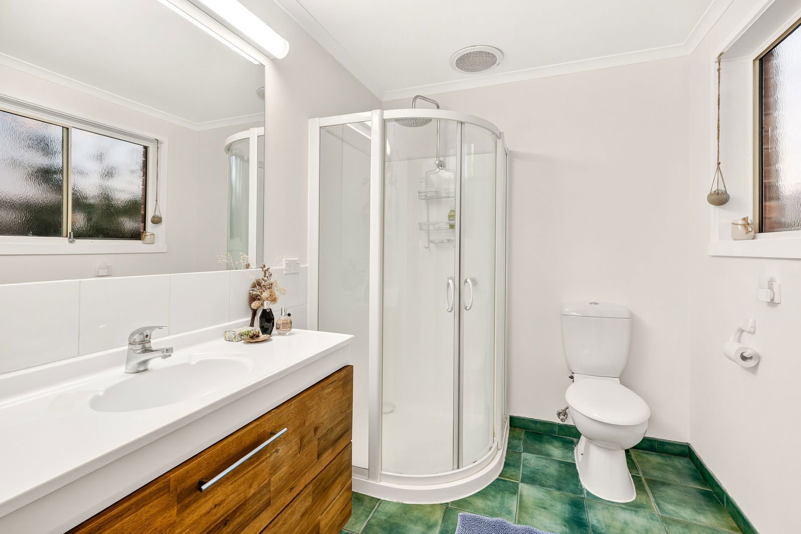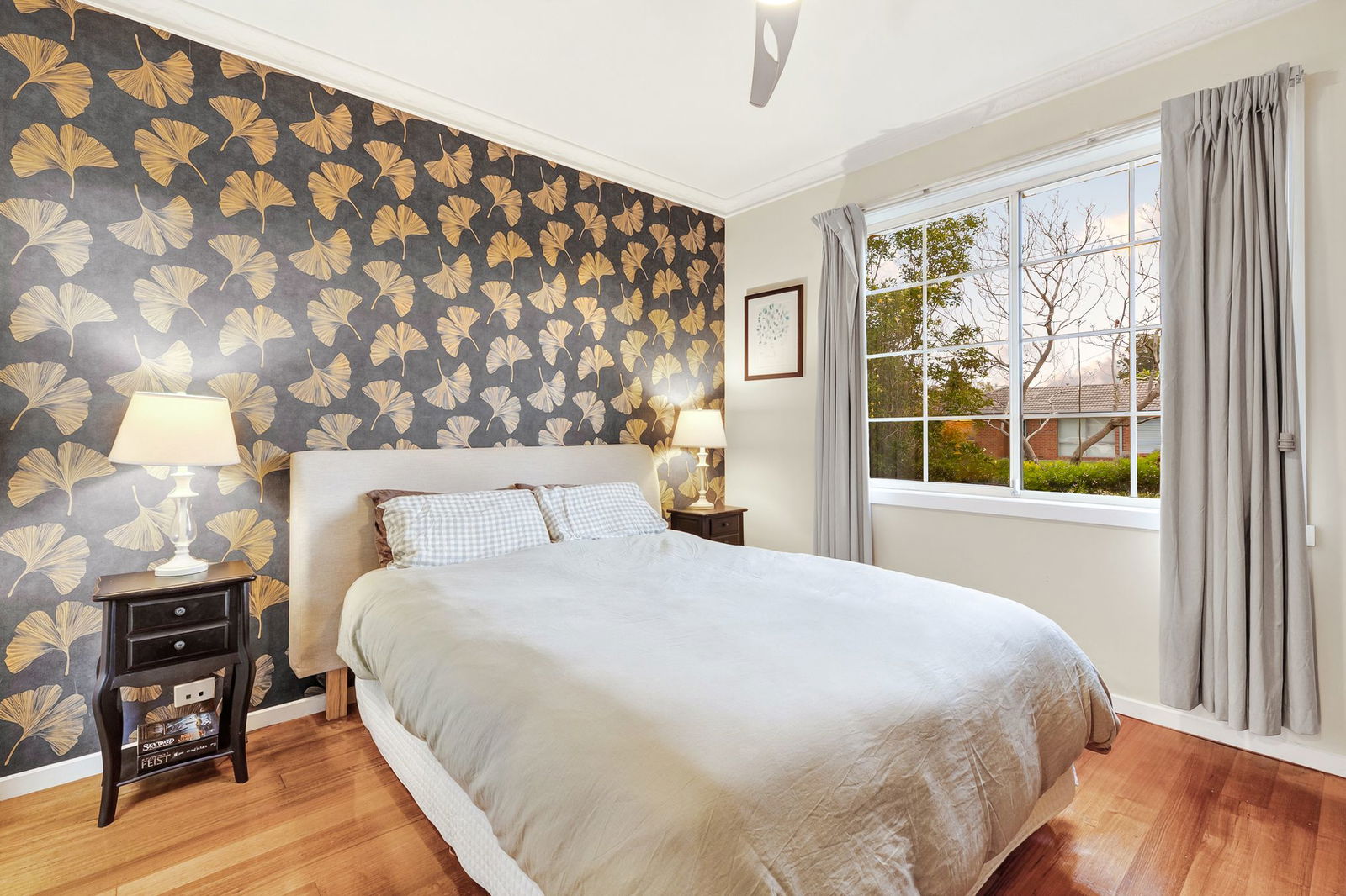 Master Suite: Solid timber floors, street-facing window with sheer and block-out curtains, ceiling fan, walk-in robe, and ensuite with corner shower, toilet, and single vanity with underbench storage.