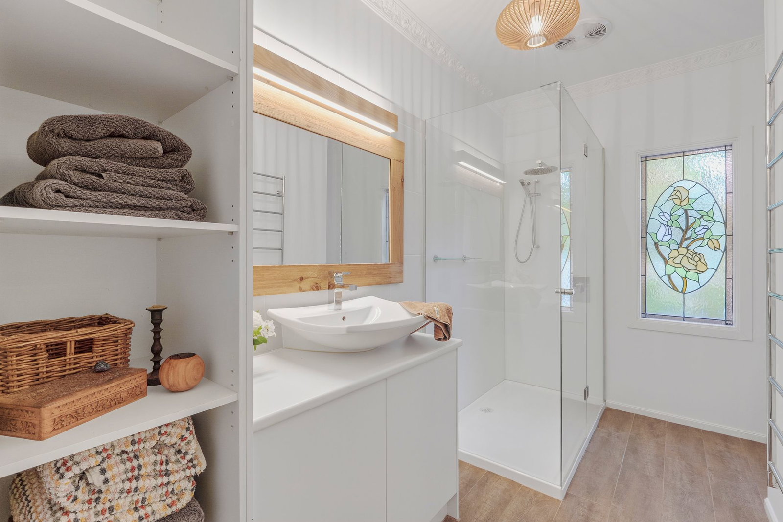 Master Suite: Hardwood flooring, pendant light, window with plantation shutters, large wall mirrors, and ensuite with single vanity with underbench storage and Kohler sink, oversized shower with dual head, open shelving, leadlight window, toilet, and heated towel rail. Concealed built-in robe with extensive shelving and custom show drawers.