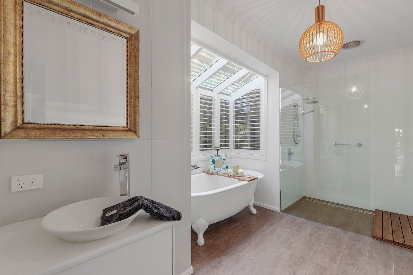 Main Bathroom: Atrium-style recess with freestanding Victoria & Albert claw foot bath, plantation shutters, tiled floor, single vanity with underbench storage and Kohler sink, open shelving, pendant light, walk-in shower with rain head and hand-held, and heated towel rail. Separate Geberit toilet.