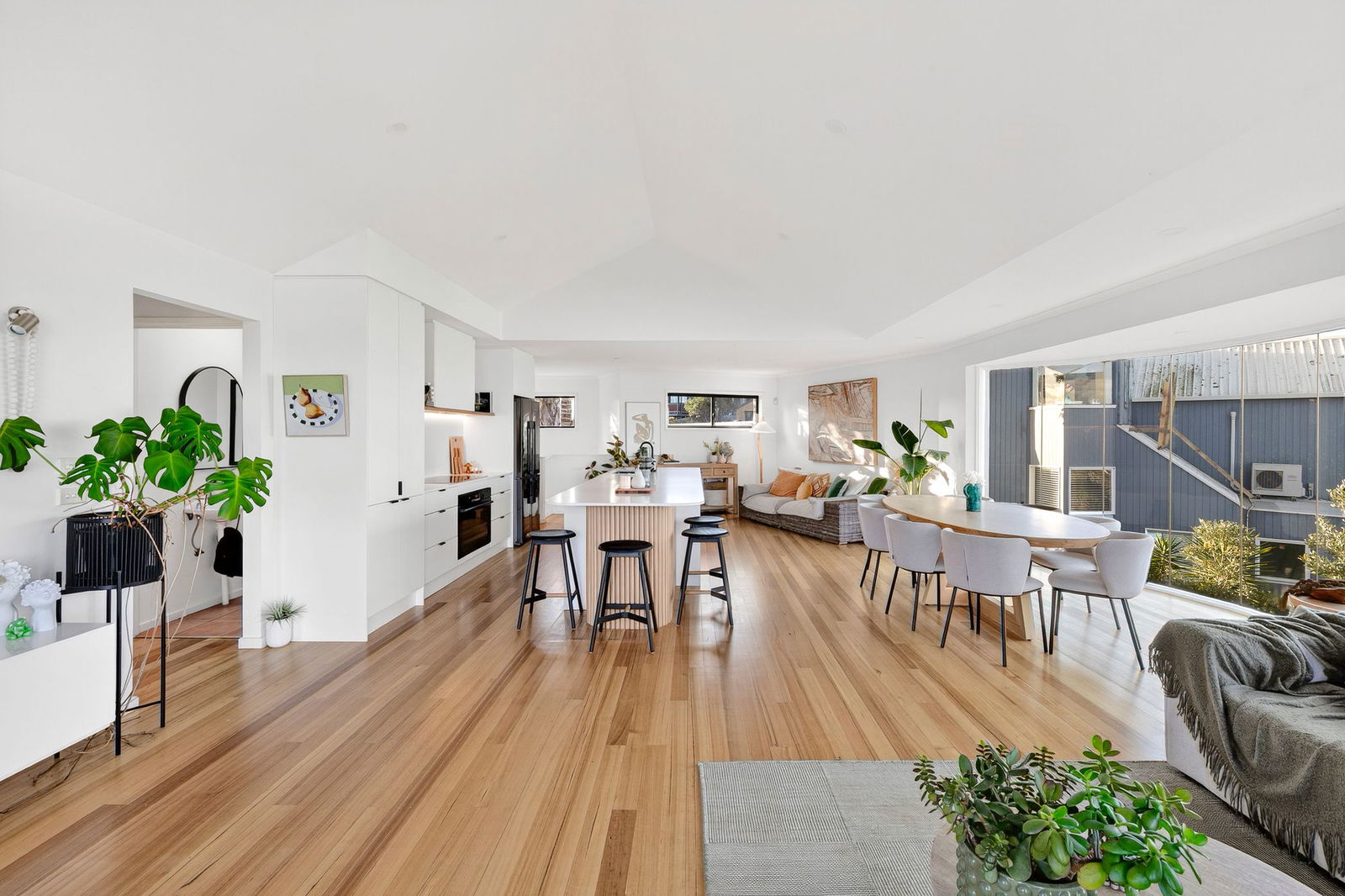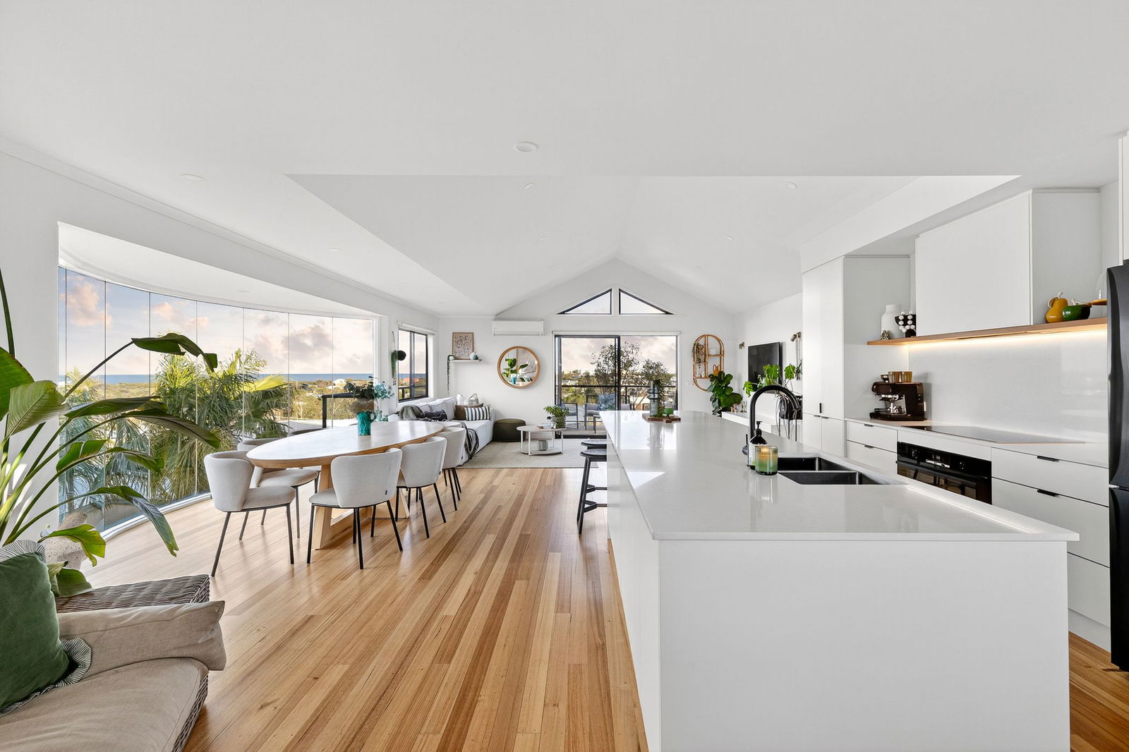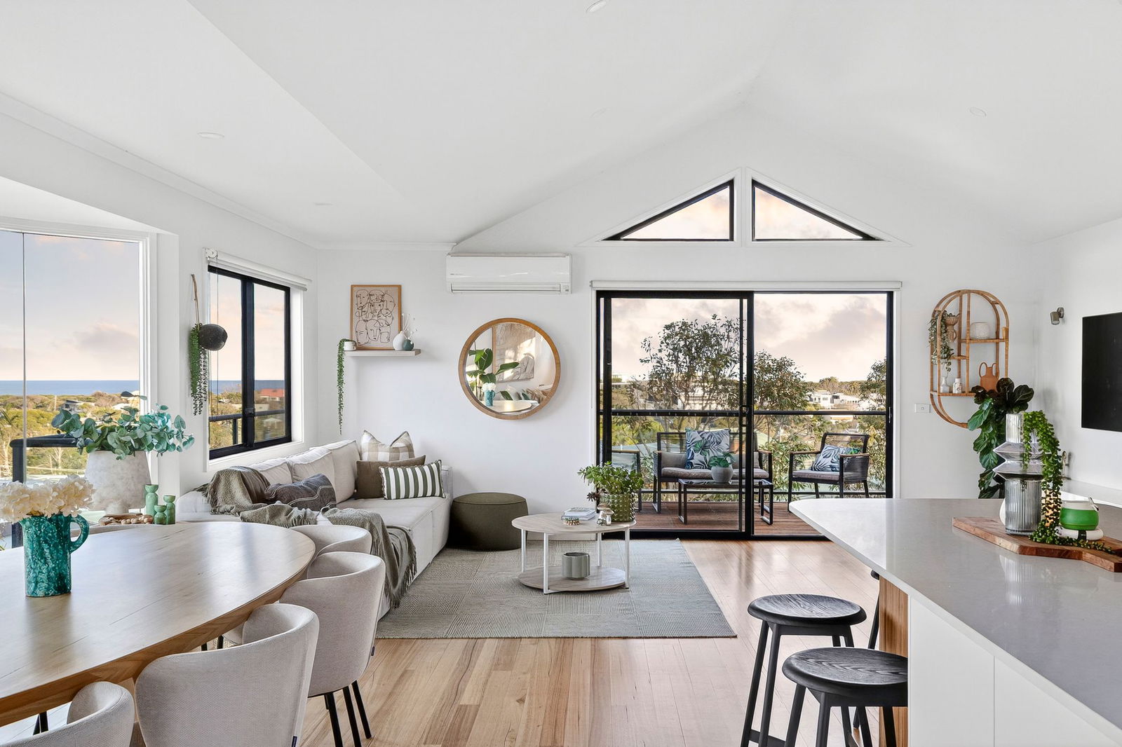 Living/Dining – Open plan living and dining area filled with natural light, timber flooring, pitched ceilings, downlights, split system air conditioning, ducted heating, engineered glazing framing priceless ocean views, sliding doors opening up onto timber balcony