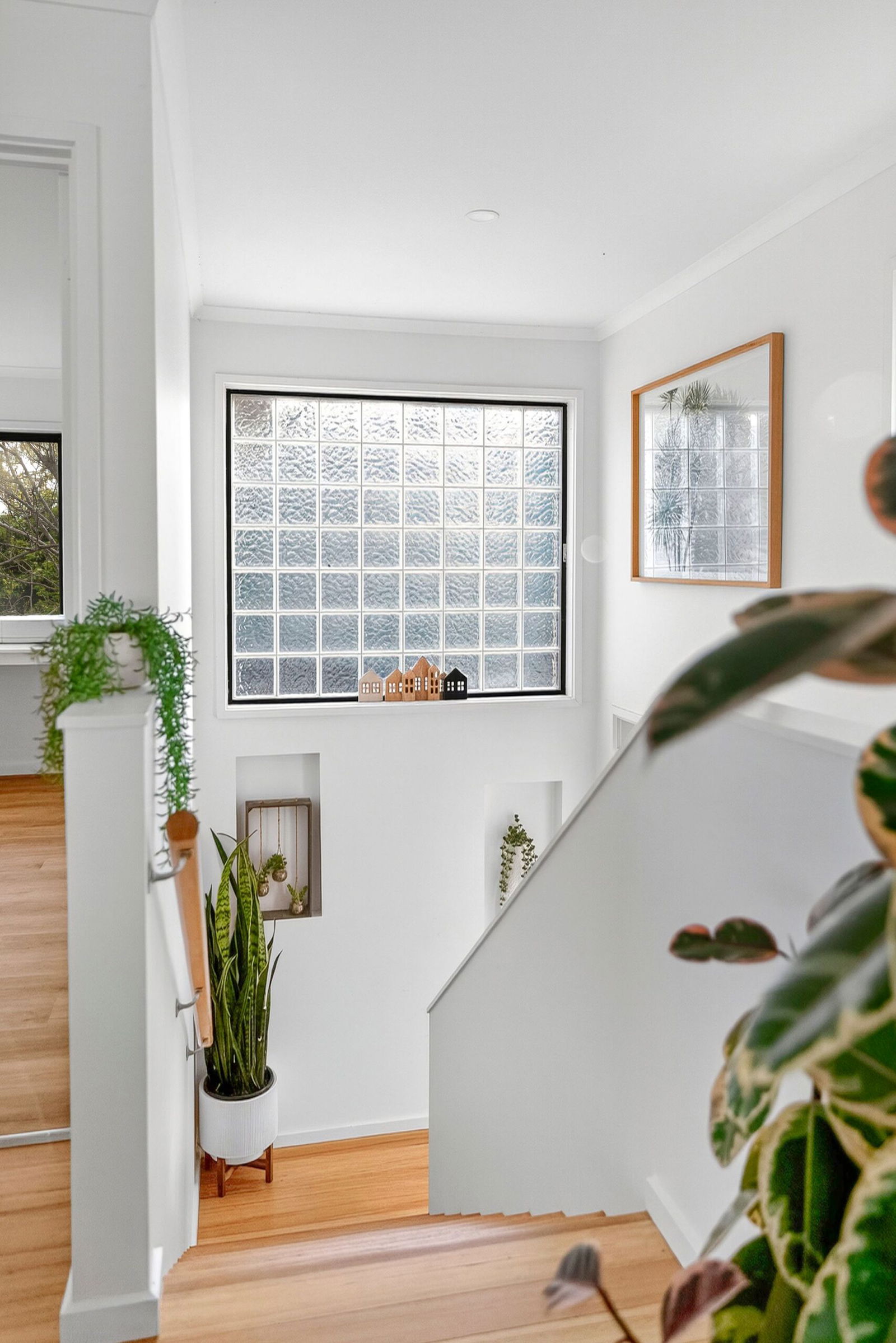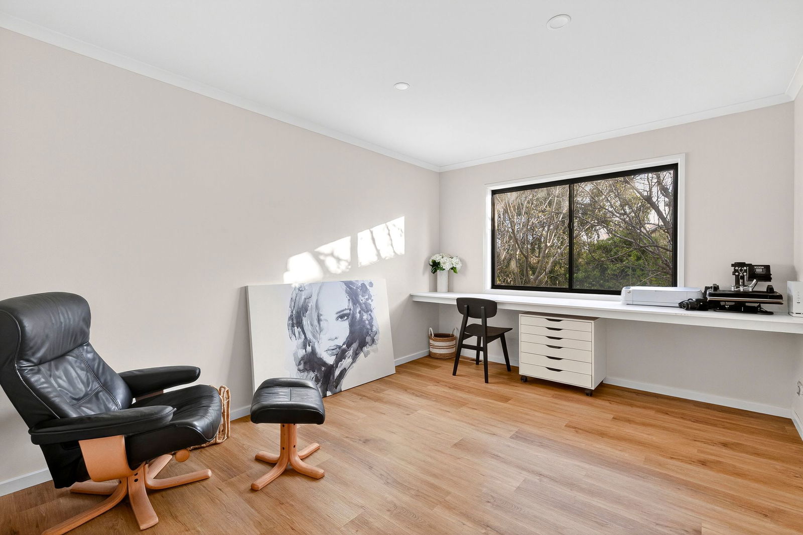 Bedroom/Studio – Spacious room with timber floors, downlights, treetop outlooks and built-in bench, with flexibility to use as a home office, nursery, yoga/meditation space or bedroom