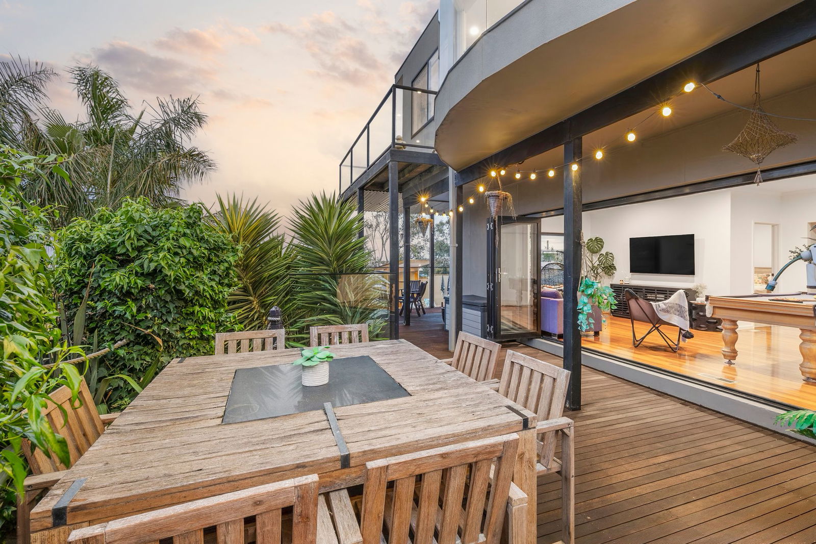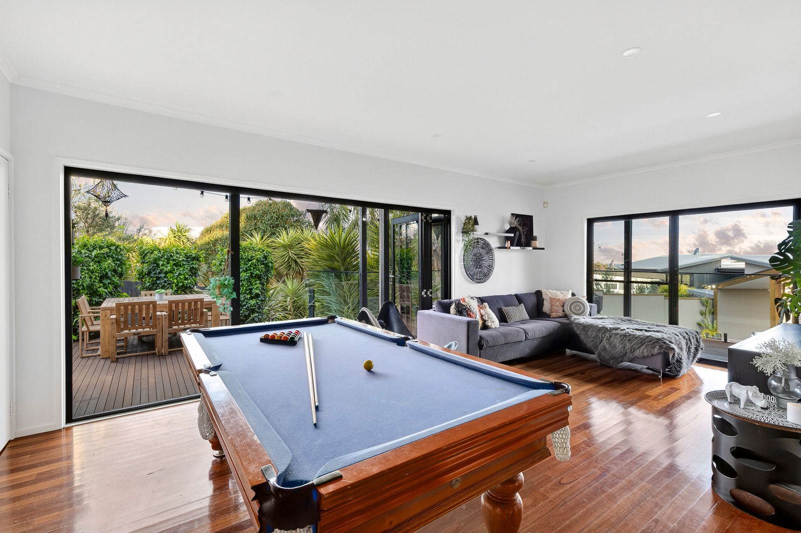 Second Living – Occupying the lower level with timber floors underfoot, billiard table, sliding door & bi-fold doors opening up to entertaining decks