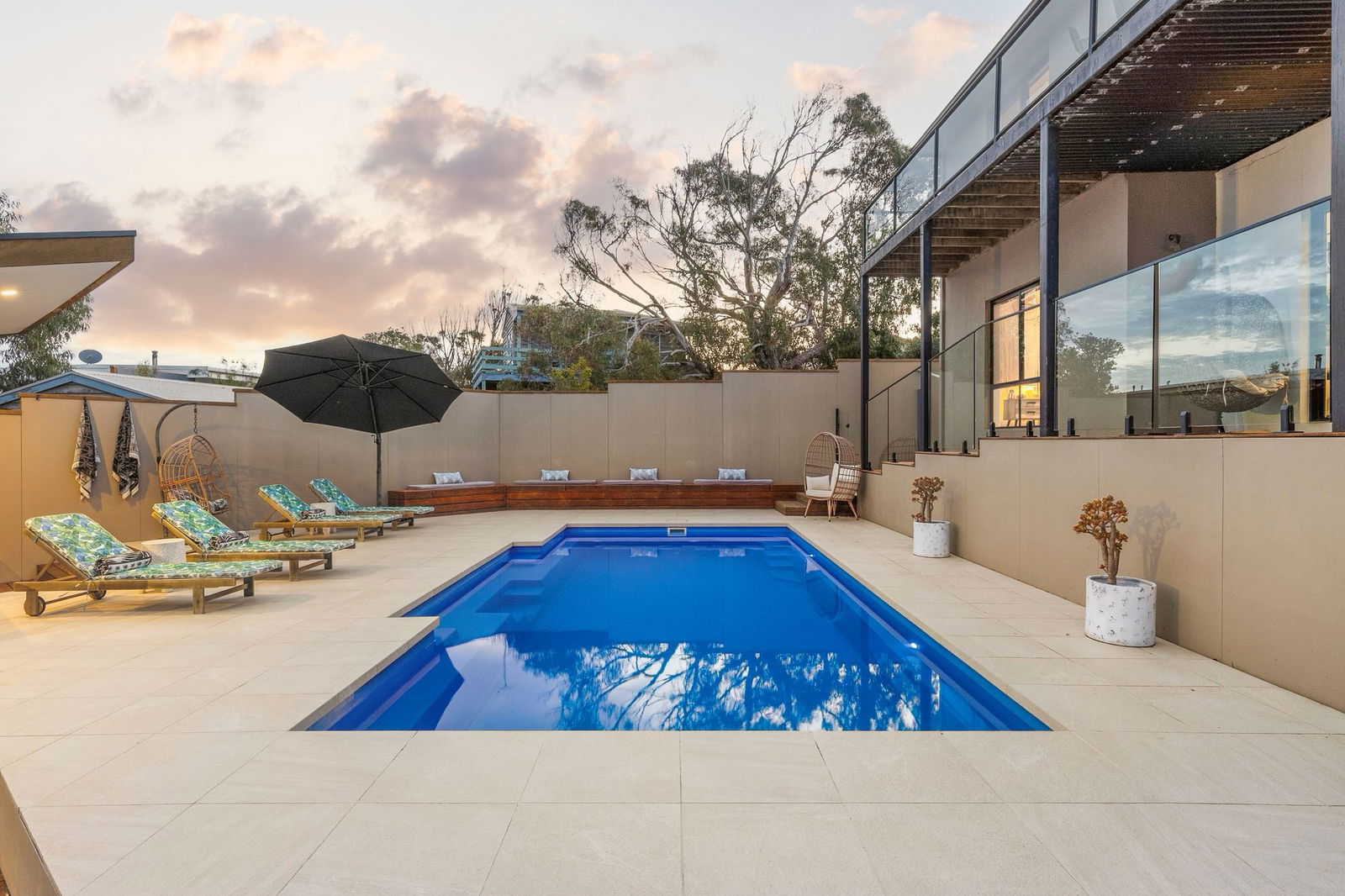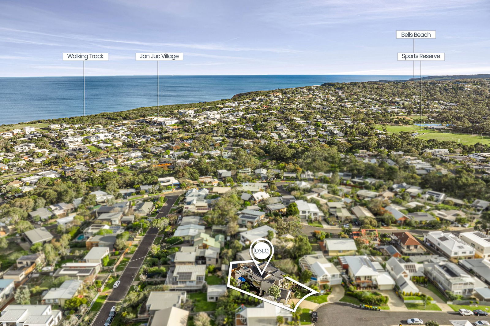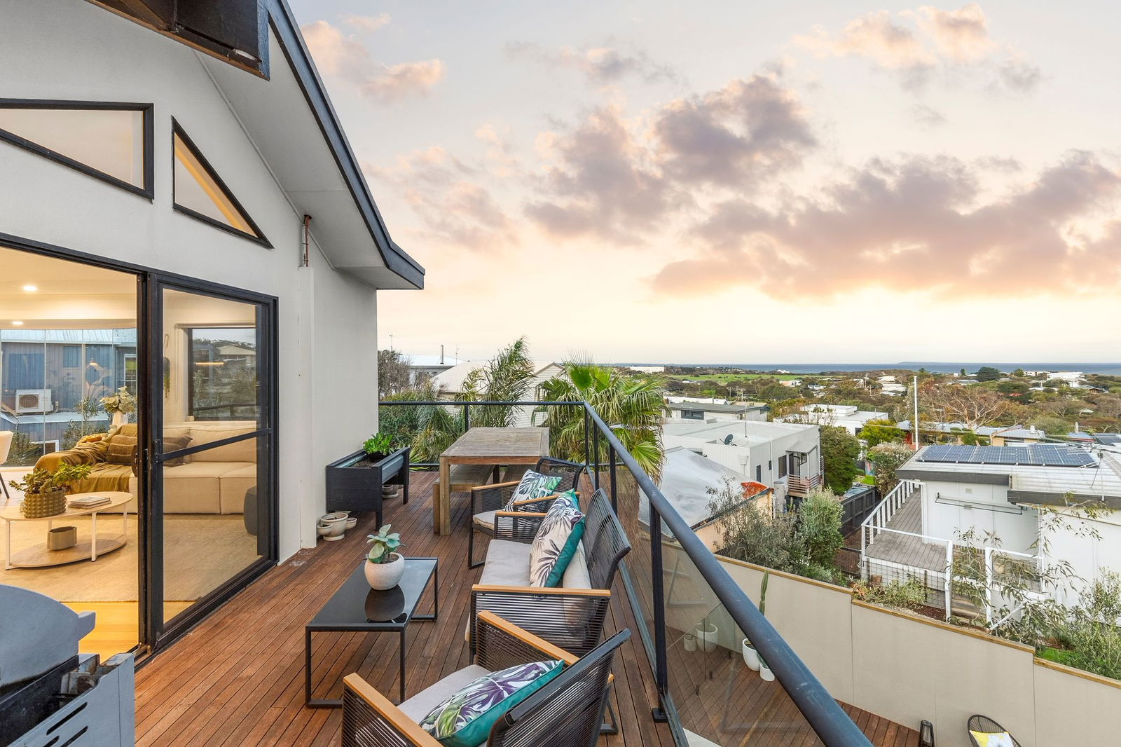 Discover a home that captures the very spirit of Jan Juc’s coastal way of life, where surf culture, family living and a resort-style setting blend in perfect harmony. From its elevated position, the upper level unveils sweeping views of Bass Strait, east to the Point Lonsdale Lighthouse and west along the iconic Great Ocean Road coastline. Here, daily rituals are defined by watching ships pass through the heads or checking the surf from the comfort of your open-plan living, new gourmet kitchen and timber balconies. Bathed in natural light, the interiors pair blonde timber floors with a crisp white palette, allowing the ever-changing ocean outlooks to take centre stage through floor to ceiling glazing. The lower level is designed for connection and relaxation, with a rumpus spilling onto a sun-soaked deck complete with pizza oven, tropical inspired gardens and a solar-heated pool with gazebo. With three bedrooms plus a versatile fourth, two stylishly renovated bathrooms and dual living zones, this coastal sanctuary ensures every day feels like a holiday.