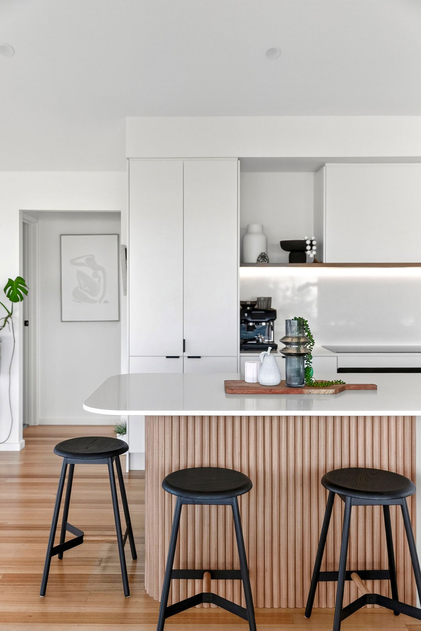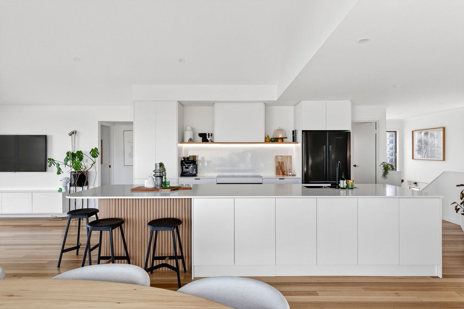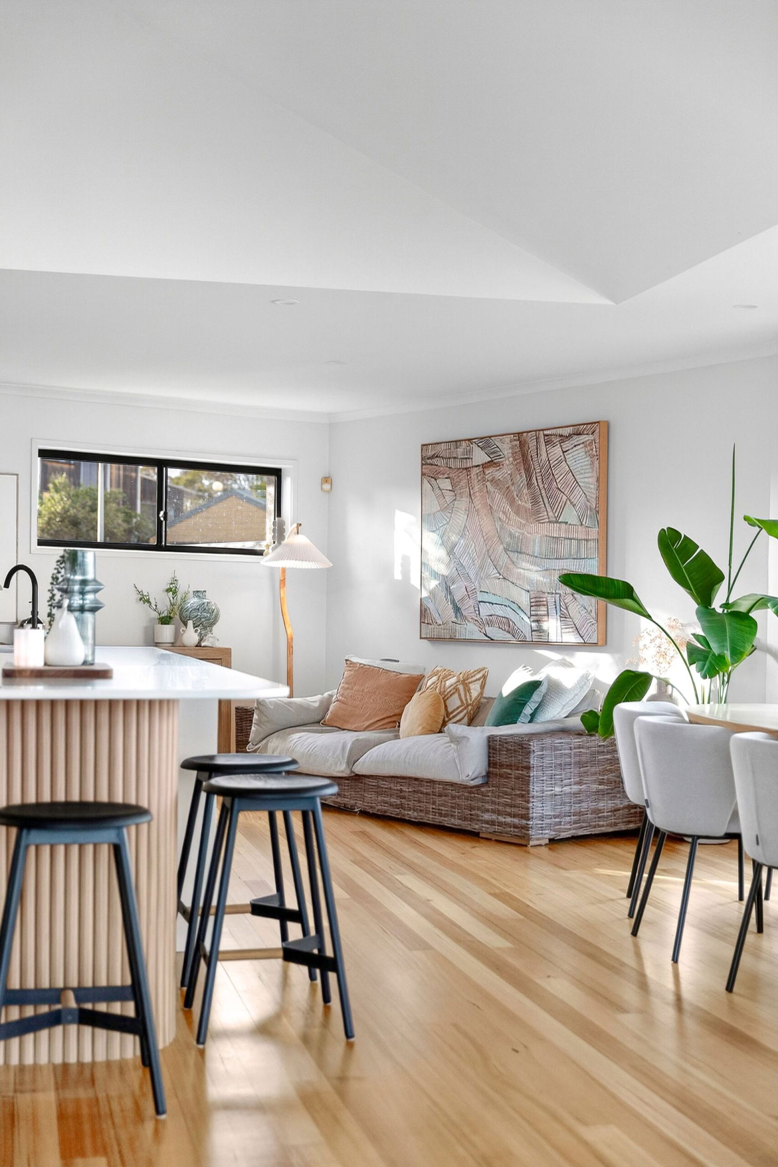 Discover a home that captures the very spirit of Jan Juc’s coastal way of life, where surf culture, family living and a resort-style setting blend in perfect harmony. From its elevated position, the upper level unveils sweeping views of Bass Strait, east to the Point Lonsdale Lighthouse and west along the iconic Great Ocean Road coastline. Here, daily rituals are defined by watching ships pass through the heads or checking the surf from the comfort of your open-plan living, new gourmet kitchen and timber balconies. Bathed in natural light, the interiors pair blonde timber floors with a crisp white palette, allowing the ever-changing ocean outlooks to take centre stage through floor to ceiling glazing. The lower level is designed for connection and relaxation, with a rumpus spilling onto a sun-soaked deck complete with pizza oven, tropical inspired gardens and a solar-heated pool with gazebo. With three bedrooms plus a versatile fourth, two stylishly renovated bathrooms and dual living zones, this coastal sanctuary ensures every day feels like a holiday.