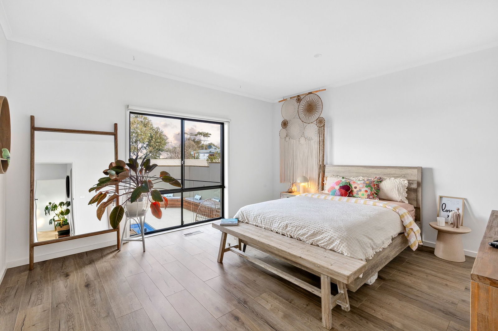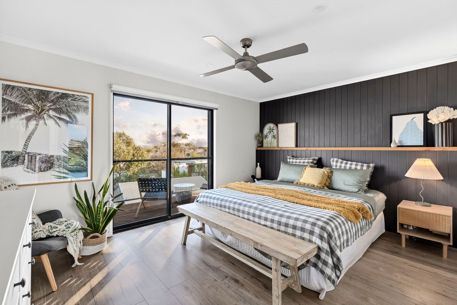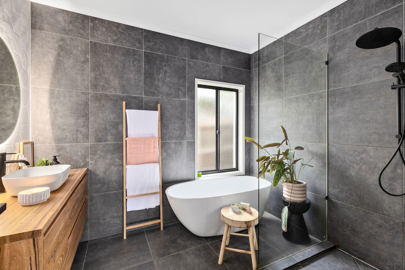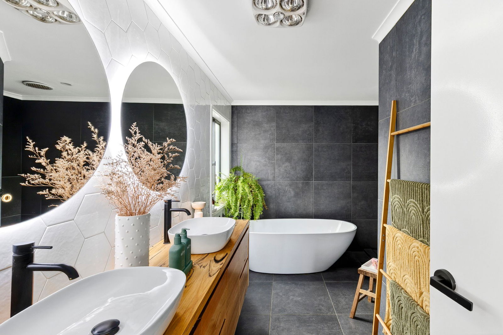 Master Suite – Beautifully appointed master bedroom with walk in robe, engineered timber floor, sliding door access to timber balcony, blinds, downlights, ceiling fan, luxurious ensuite bathroom with shower, custom timber vanity, dual basins LED mirror, hexagon tiled splashback, freestanding oval bath, black tapware & dual shower heads; and tiled shower niche