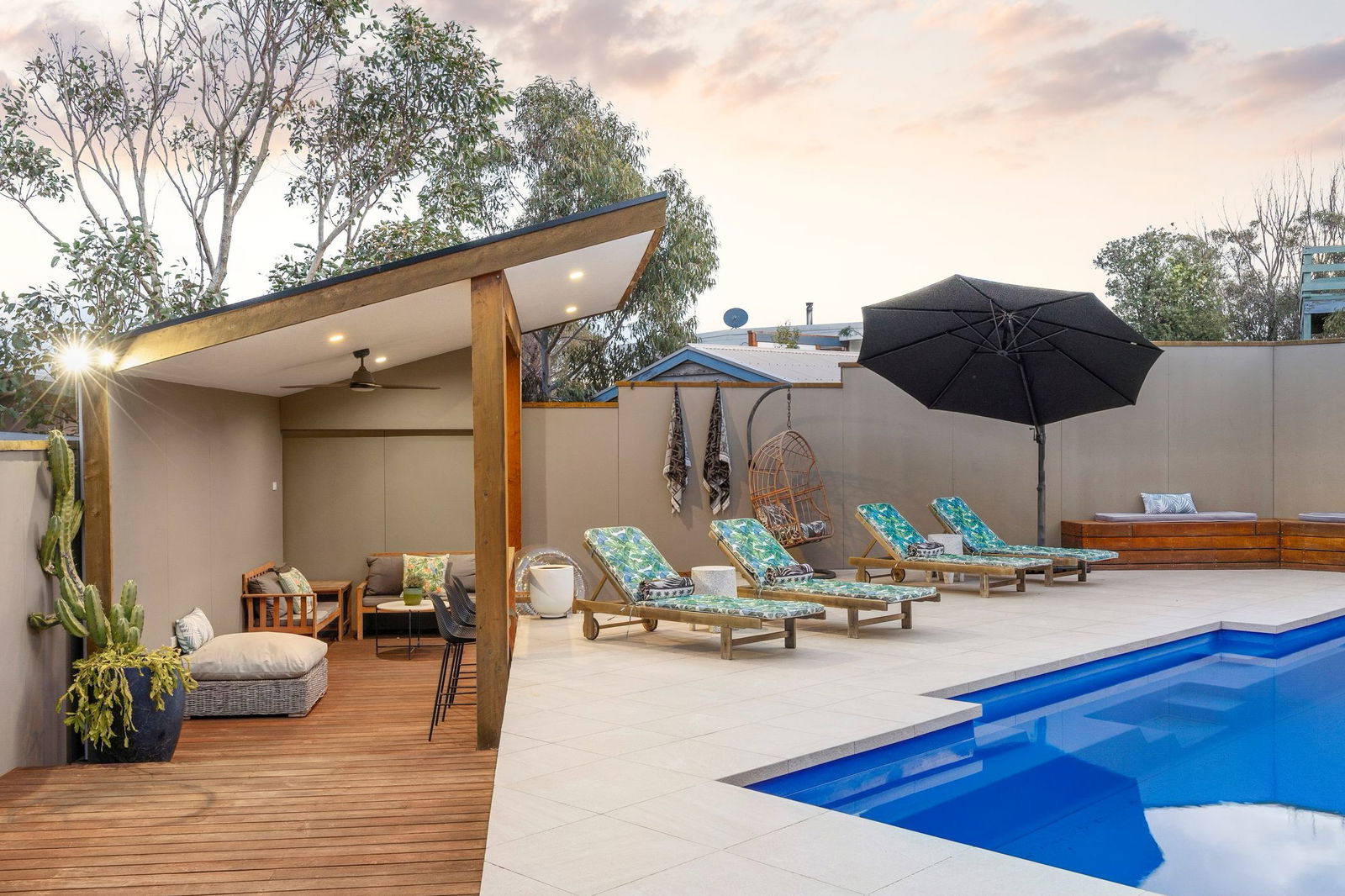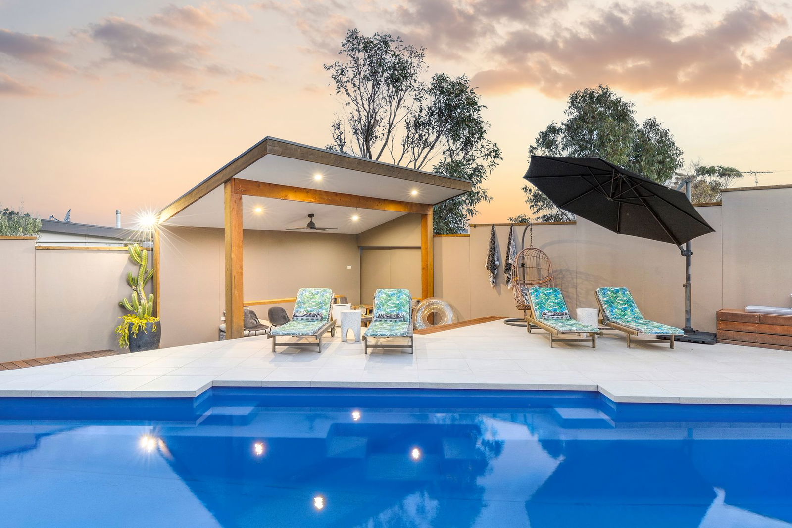 Outdoors – Quiet court location elevated to capitalize on priceless ocean views, multiple sun decks, resort style setting with solar heated in-ground pool (completed 2020), sunken gazebo with downlights & ceiling fan, pizza oven, built-in timber seating, beautifully landscaped gardens, oversized double garage with workshop space, additional off street parking for trailer/boat