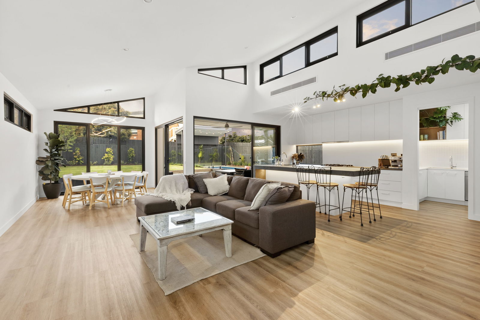 Open Plan Living/Dining: Hybrid floorboards, soaring architectural ceilings, highlight windows, feature dining pendant, large bank of windows, stacker door access to alfresco.