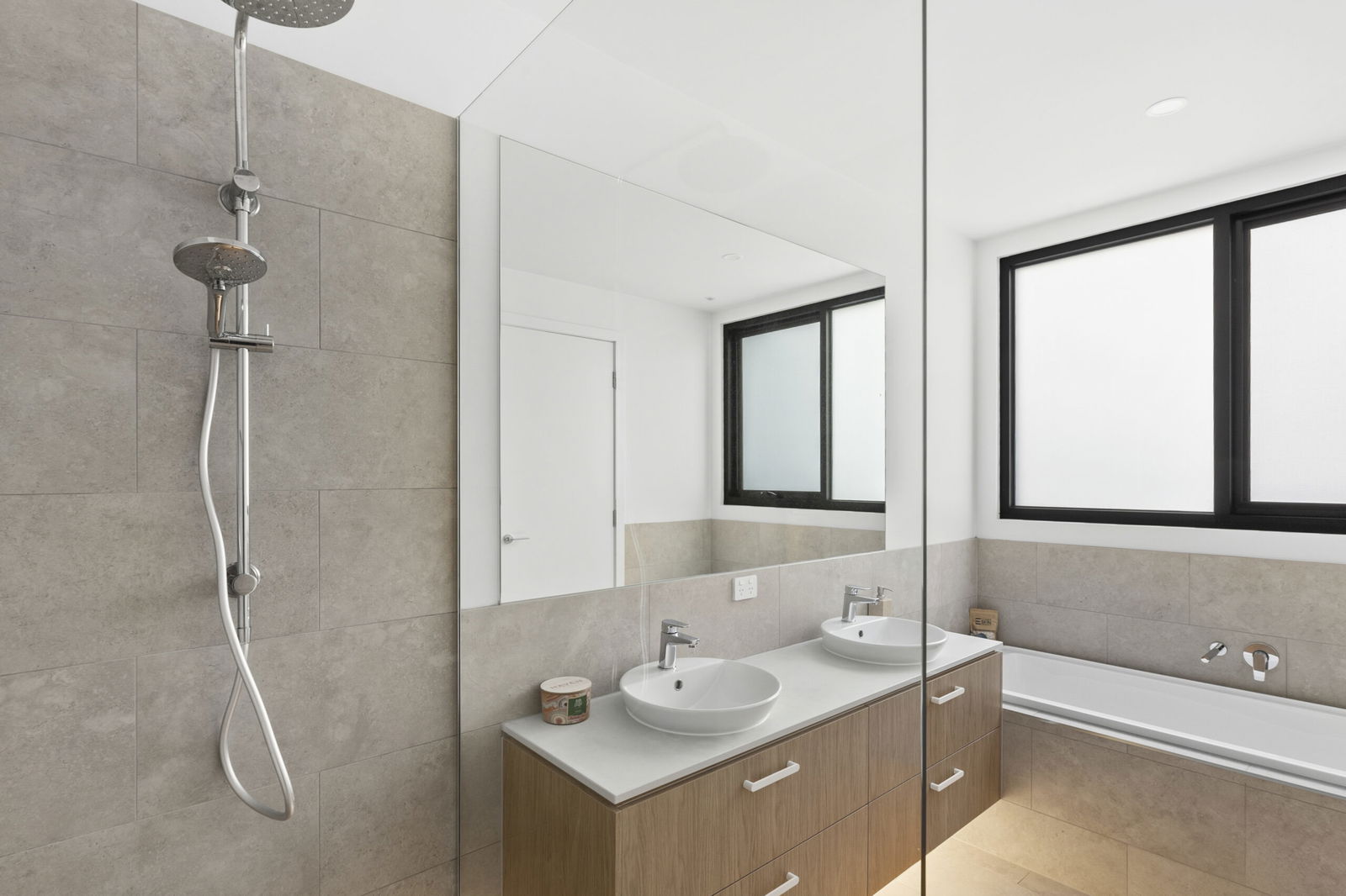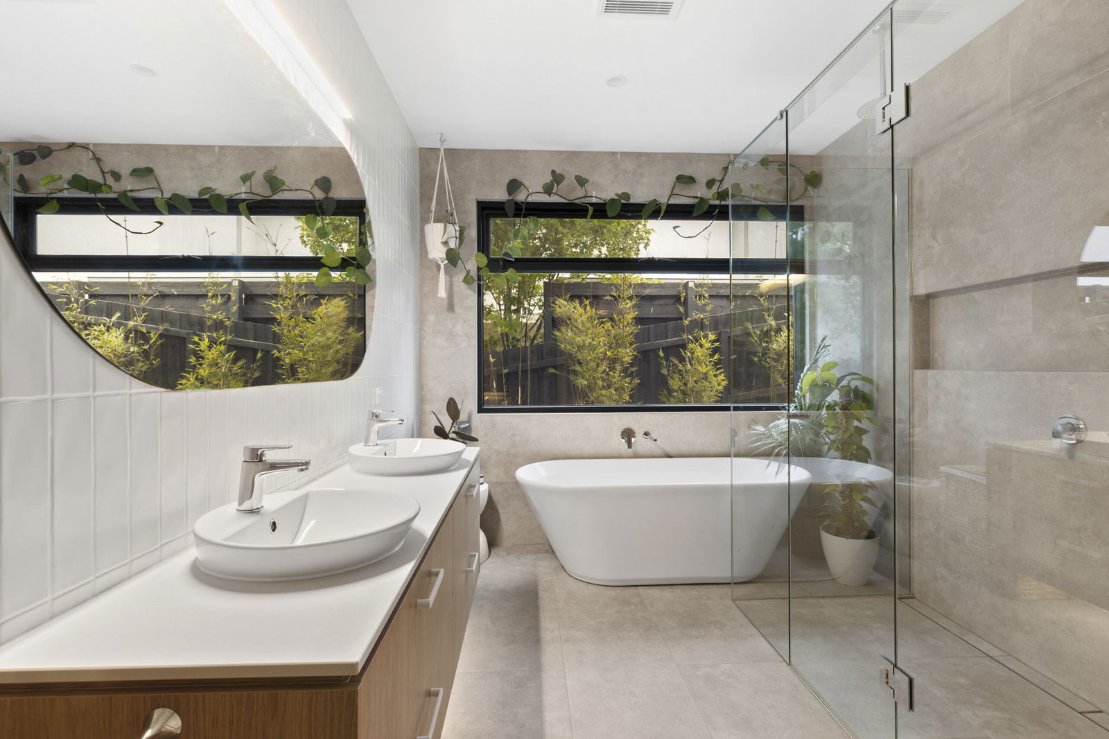 Master Suite: Carpet underfoot, street-facing windows, balcony access, wall lights, walk-in robe, and ensuite with floating dual vanity with feature lighting, freestanding tub, frameless double shower with wall niche and tiled base, full-height tiling, under tile heating, and separate toilet.
