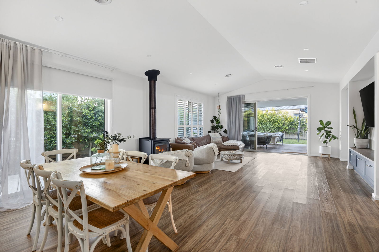 Living/Dining – Expansive open-plan living and dining domain with vaulted ceilings, engineered timber flooring, ducted heating, evaporative cooling, seamless outdoor integration and abundant natural light, open wood fireplace