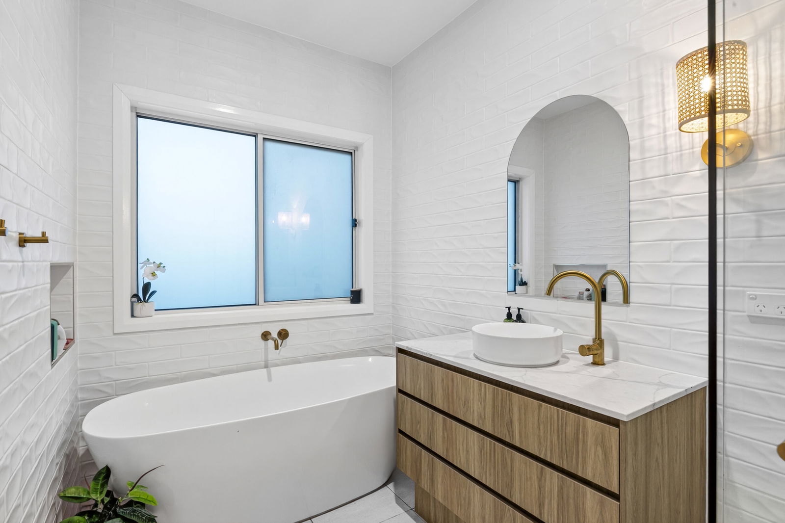 Main Bathroom – Sleek and contemporary, offering a freestanding bath, stylish finishes and ample light, complemented by blonde timber veneer cabinetry and brass fittings