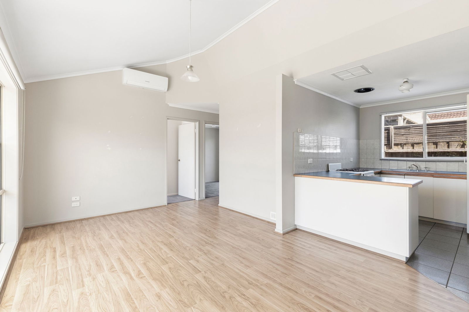 Open Plan Living/Dining: Hard-wearing floors, raked ceiling, split-system heating and cooling unit, central pendant light, window bank with sliding door access to a covered outdoor entertaining area, and roller blinds.