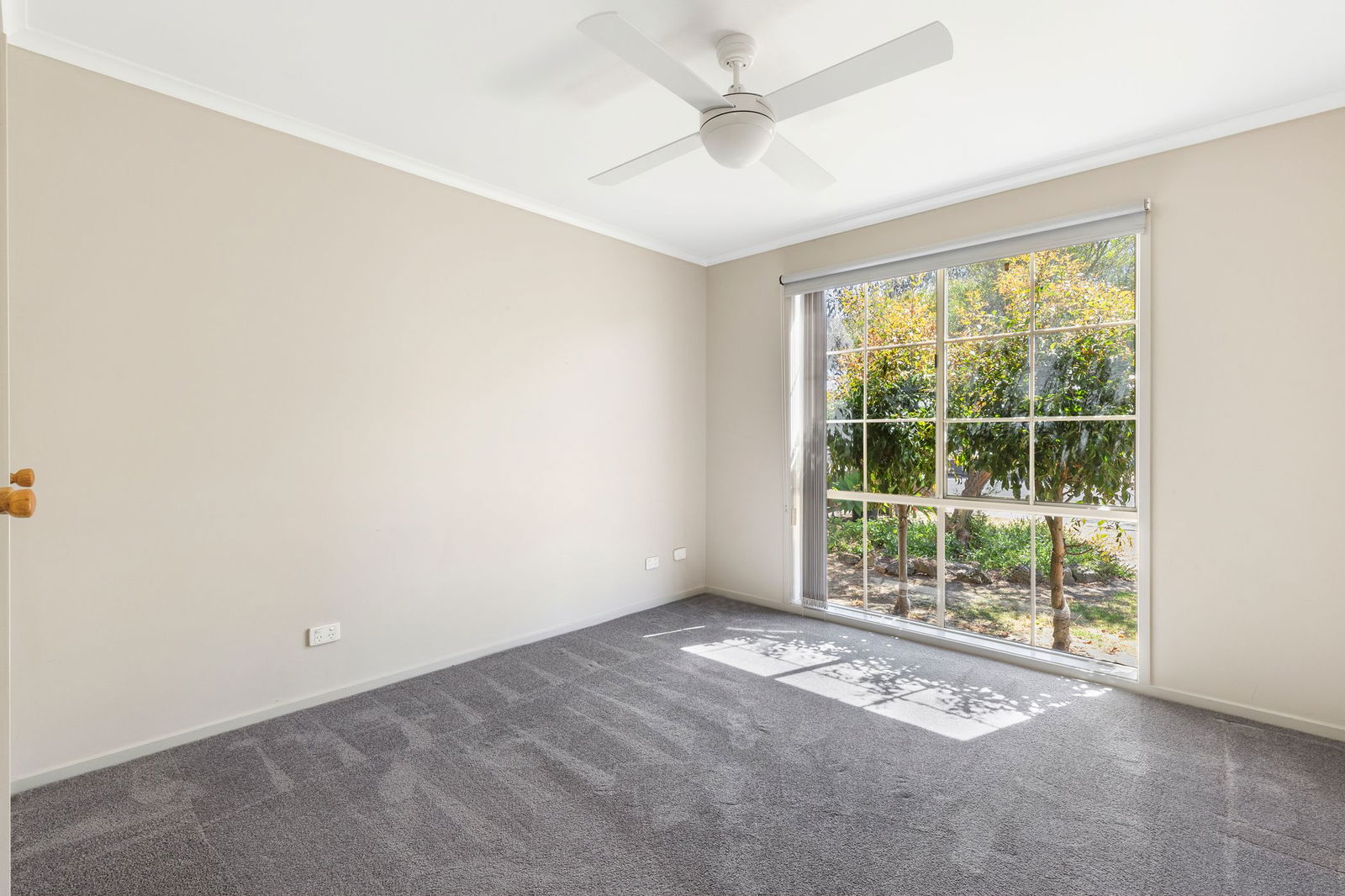 Master Suite: Plush carpet underfoot, ceiling fan, grid window with street-facing aspect and roller blind, and built-in robe.