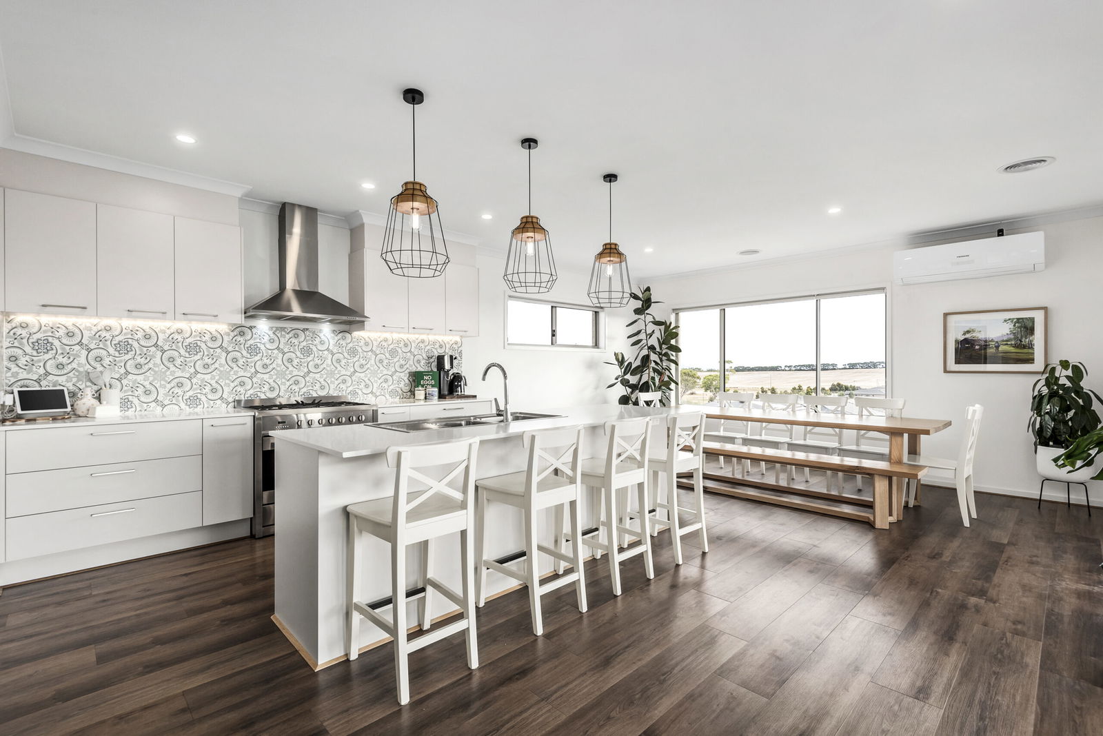 Kitchen: Stone benchtops, island bench with in-set sink and breakfast bar, freestanding dual-fuel cooker, exposed rangehood, feature pendant lighting. Feature tile splashback, ample cabinetry including overhead cupboards, walk-in pantry, dishwasher and generous fridge cavity.