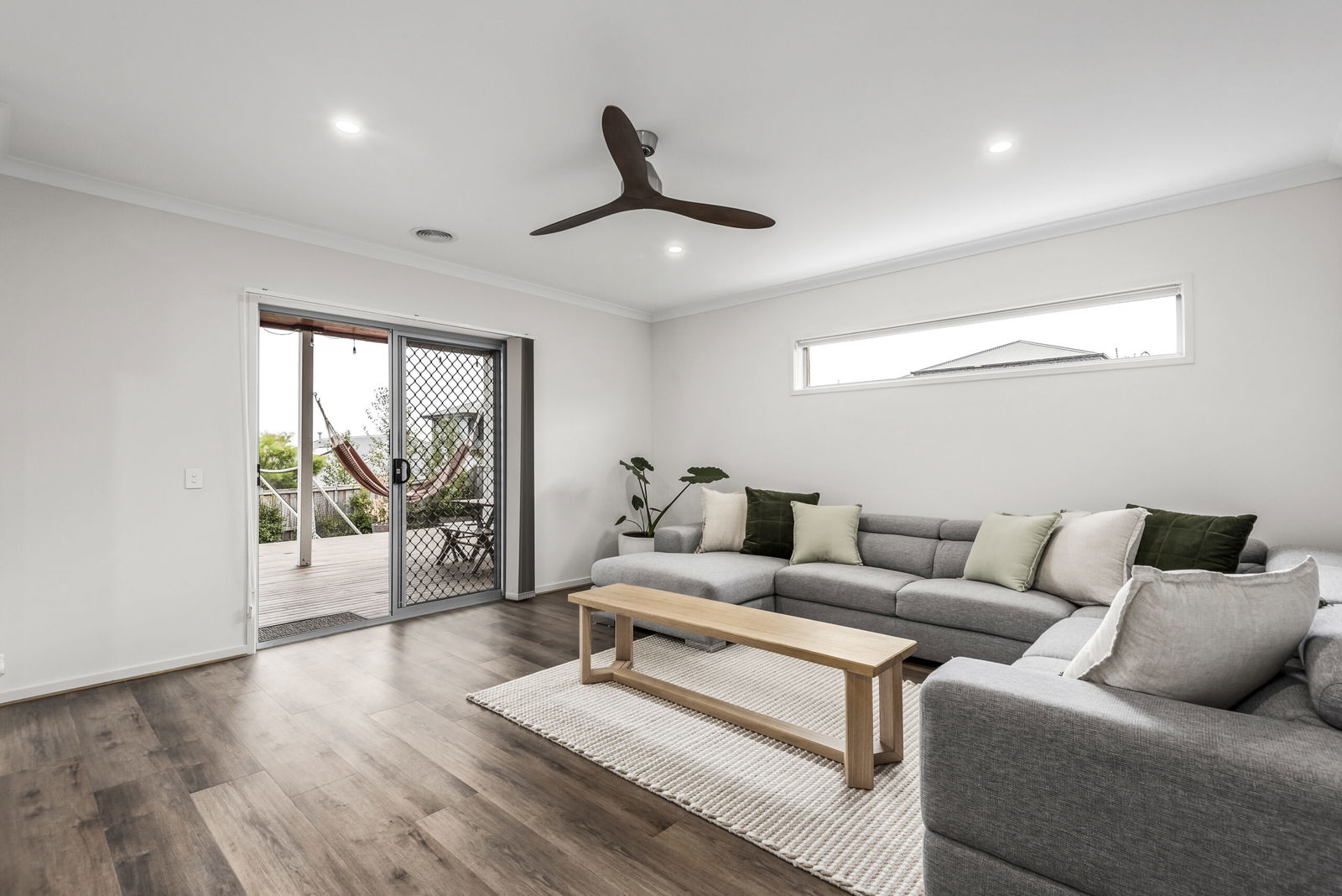 Lounge: Engineered timber floors, downlights, highlight window, and sliding door access to rear deck alfresco.