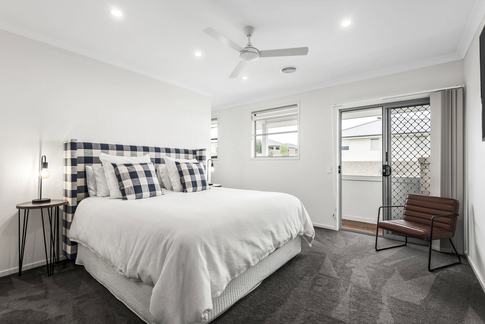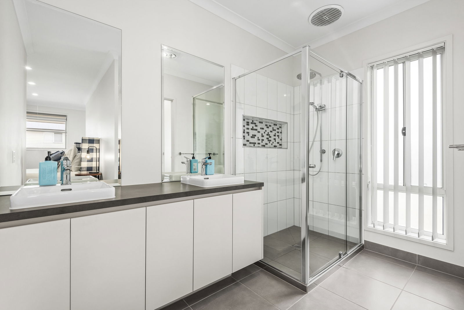 Master Suite: Plush carpet, ceiling fan, downlights, and sliding door access to private balcony. Walk-in robe and ensuite with a dual vanity ensuite with underbench storage, a private toilet, and an oversized shower with niche, twin heads, and tiled base.