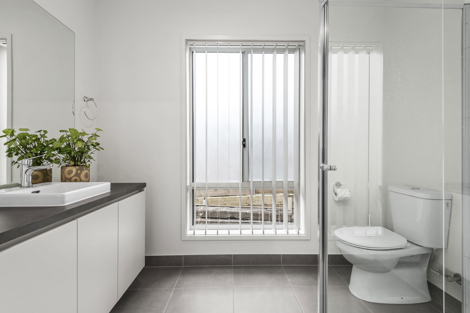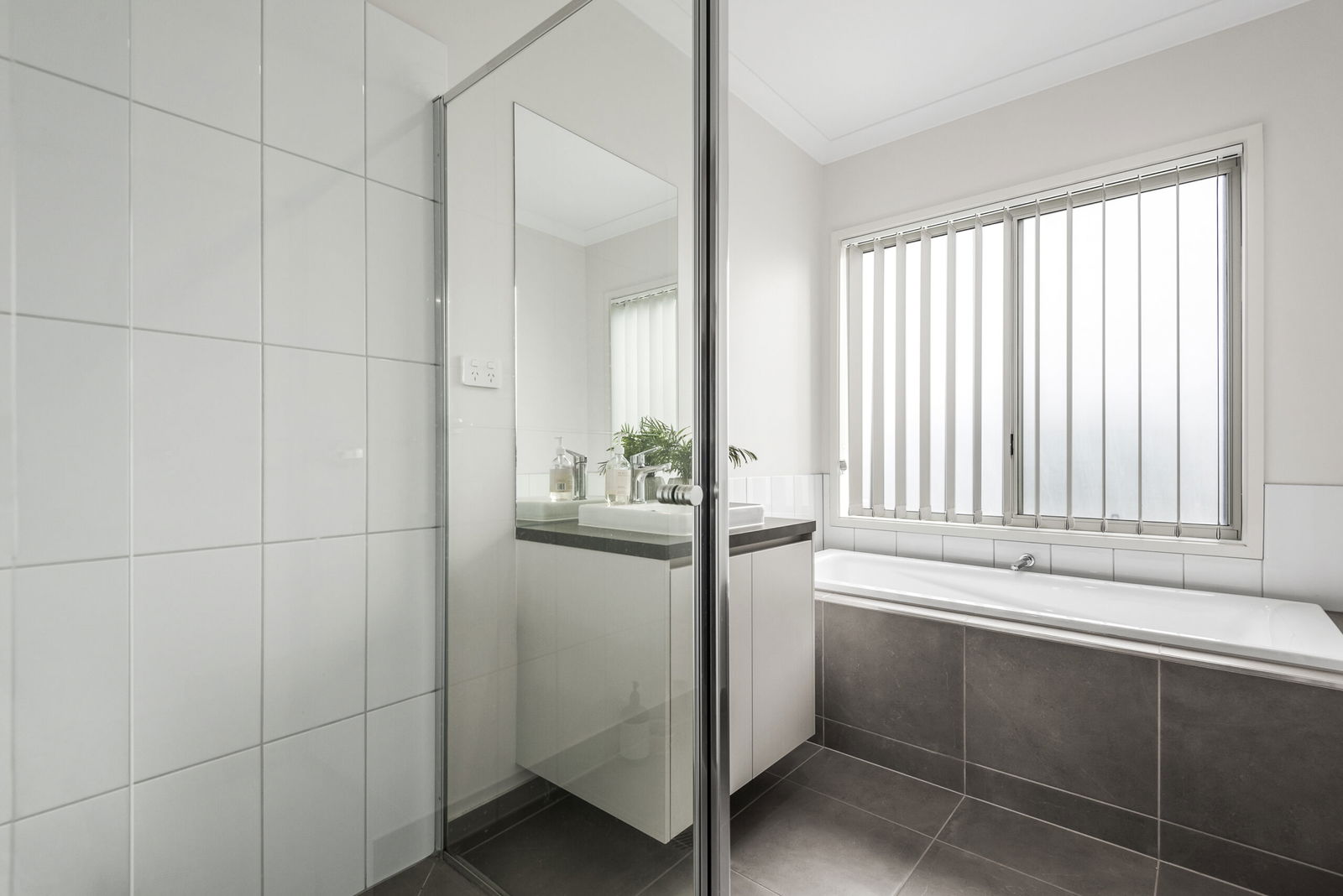 Main Bathroom: Soaking tub, shower with niche and tiled base, single vanity with underbench storage and a separate toilet.