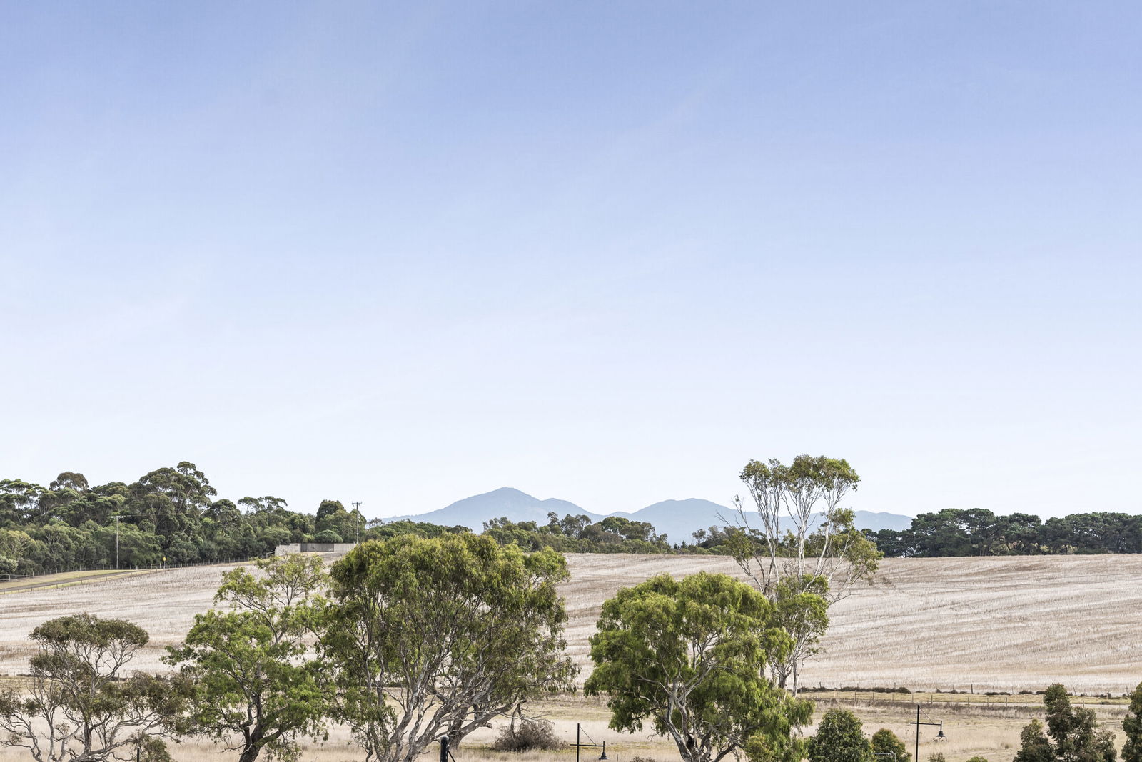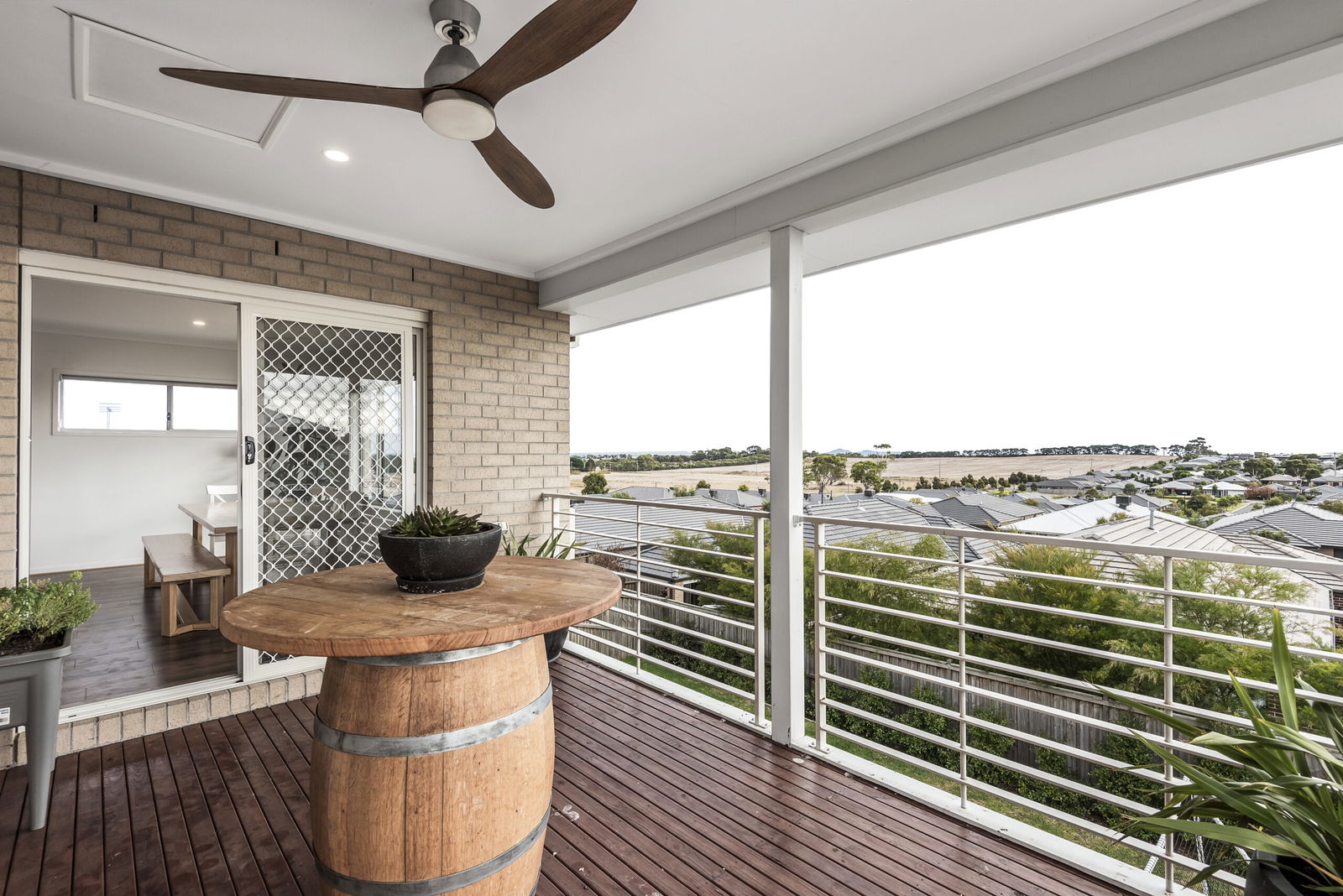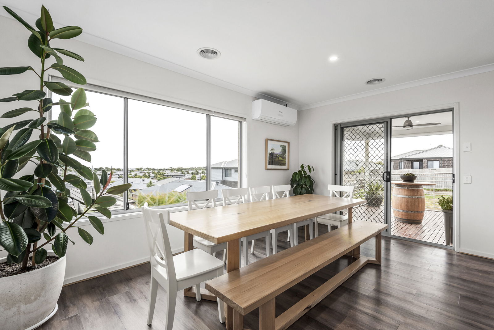 Open Living/Dining: Engineered timber floors, framed views of the neighbouring landscape, downlights, ceiling fan, sliding door access to the undercover balcony with ceiling fan.