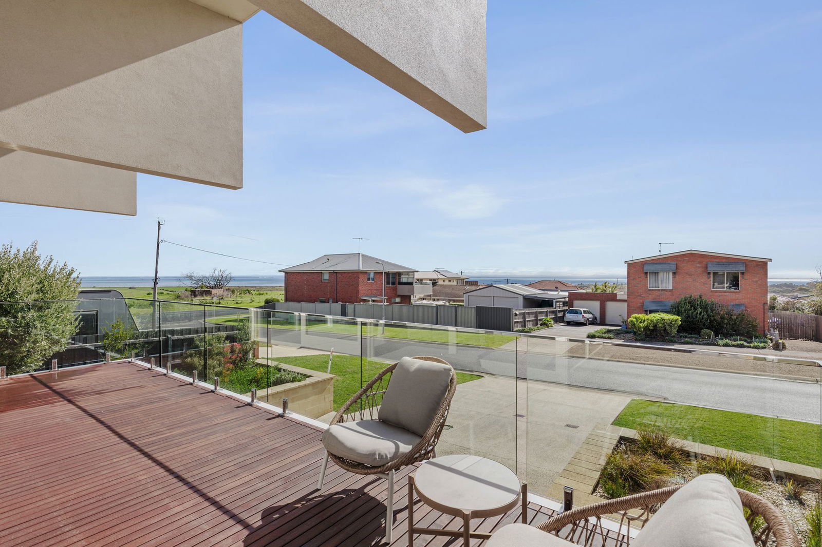 Three generous bedrooms all with full-height sliding doors opening to decks and landscaped gardens. Main bedroom features ensuite and dual front and rear deck access.