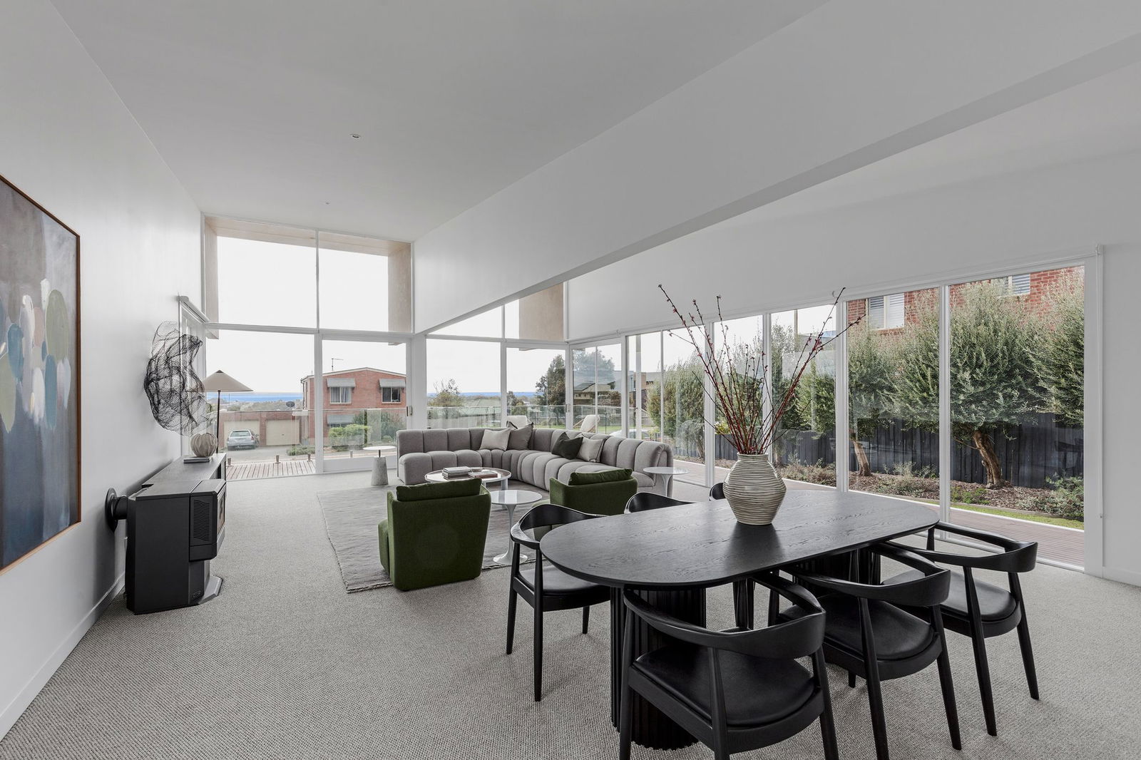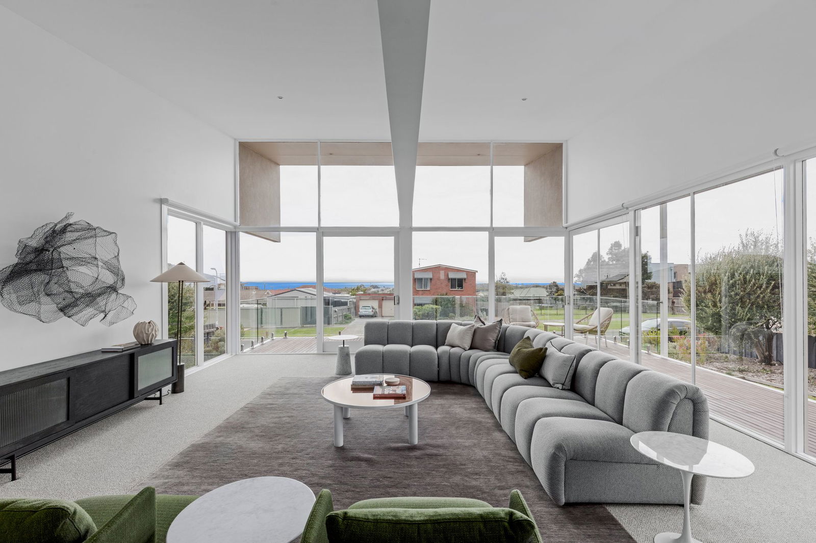 Expansive open-plan living and dining zone with floor-to-ceiling glazing, seamless indoor-outdoor flow, front view terrace, rear entertaining deck and extended exterior deck with glass balustrade.