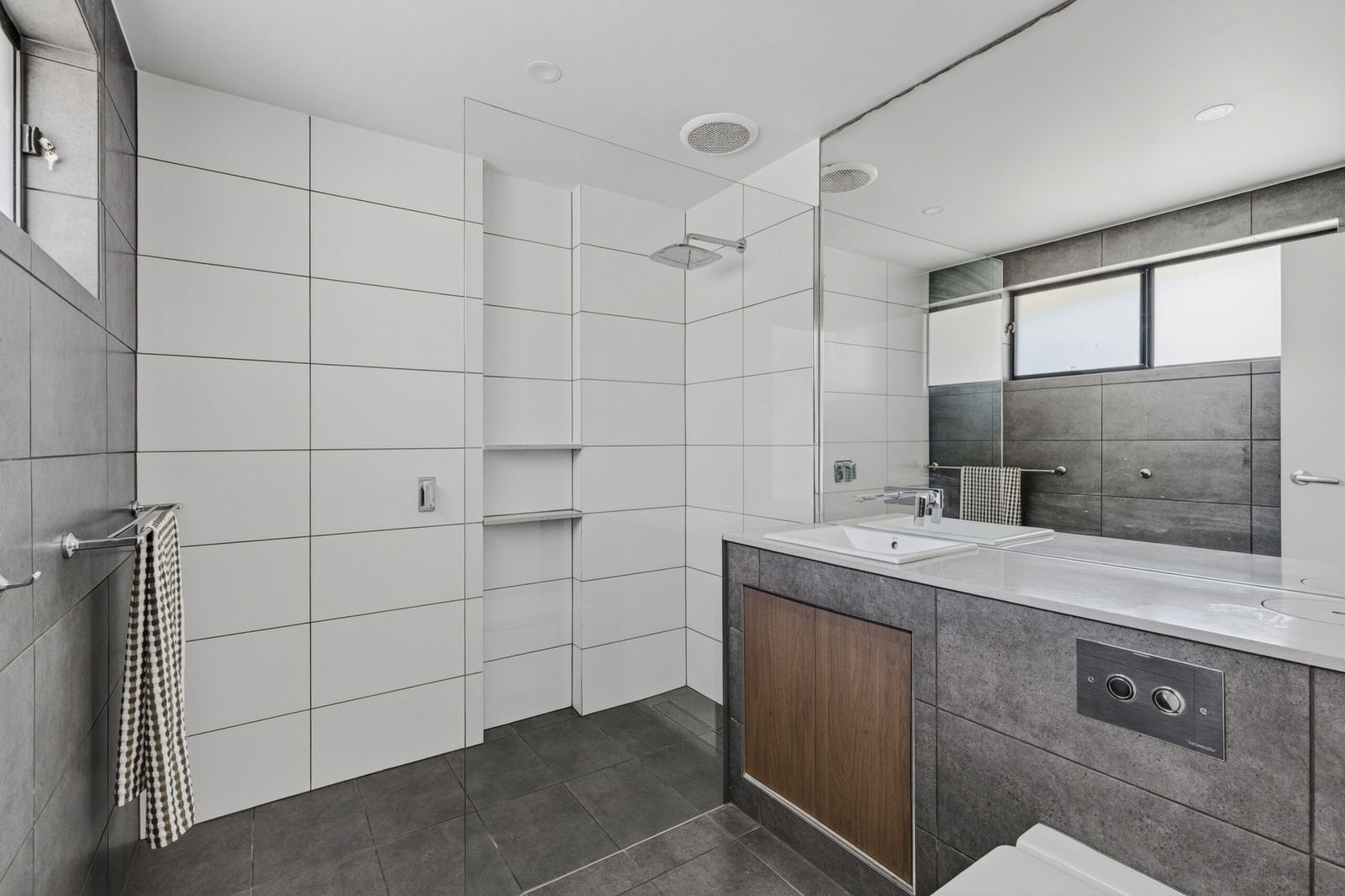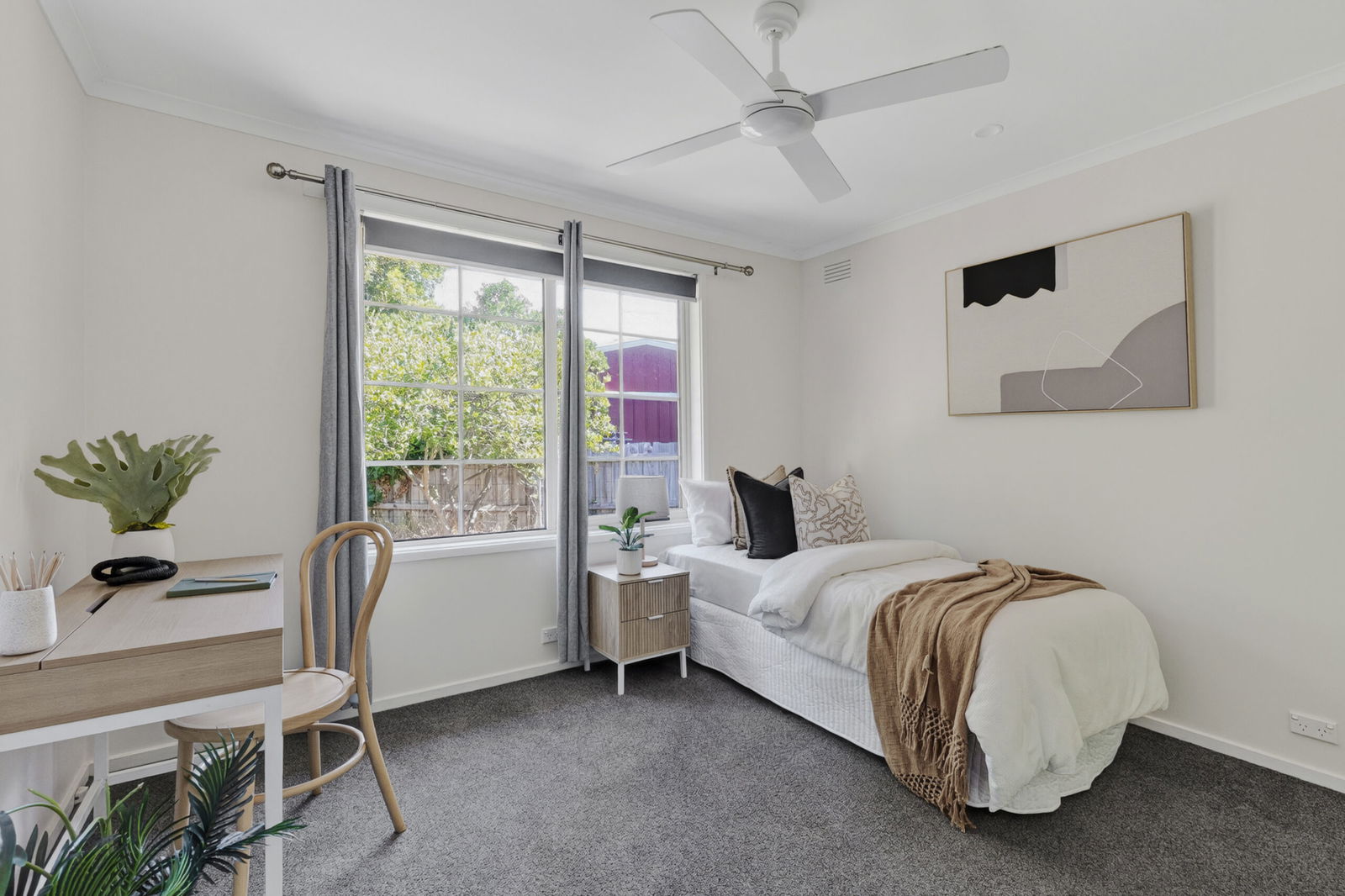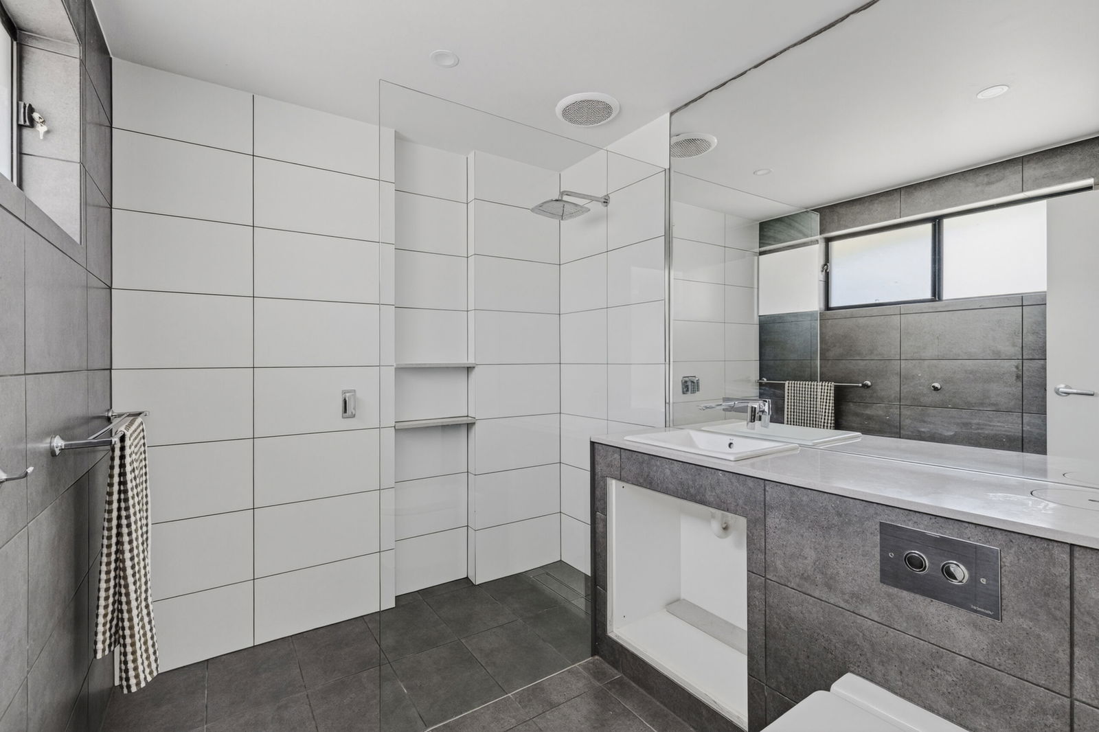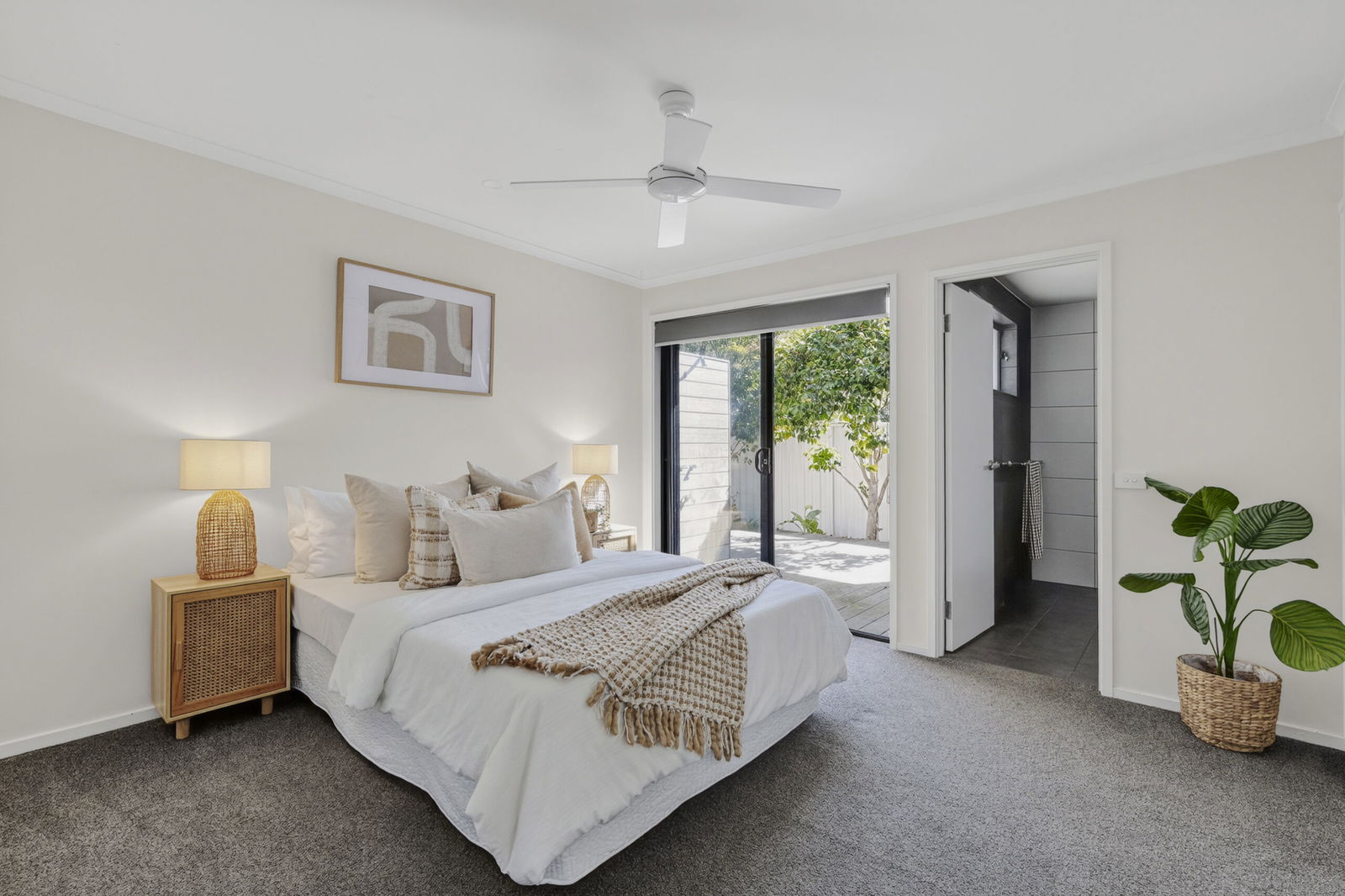 Main Suite – Privately placed master bedroom with built in wardrobes, carpet, large windows, blinds, ceiling fan, renovated ensuite bathroom with floor to ceiling tiles, rainhead shower, single vanity with large mirror and toilet. Sliding door access to private timber deck & outdoor shower