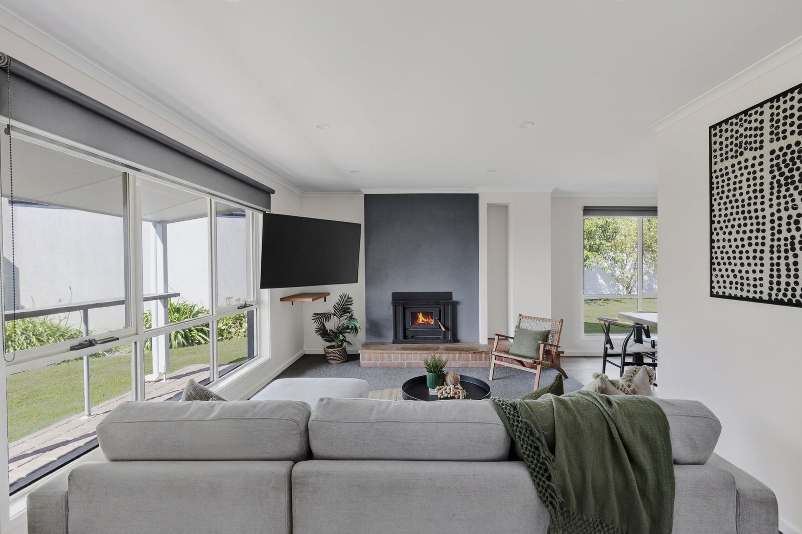 Lounge – Inviting lounge space enjoying sunny north orientation, carpet, downlights, roller blinds & wood fire
