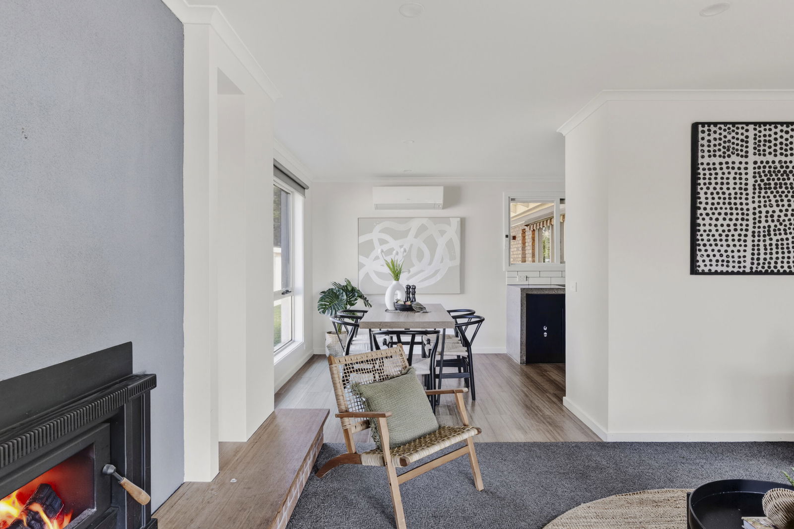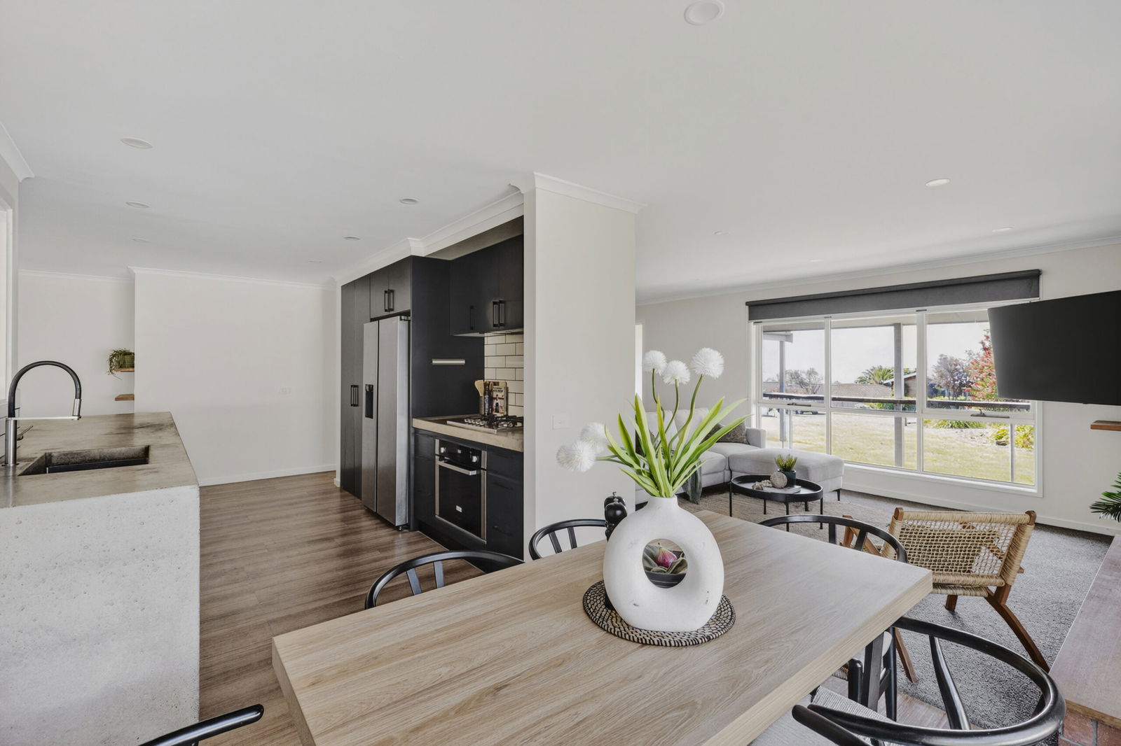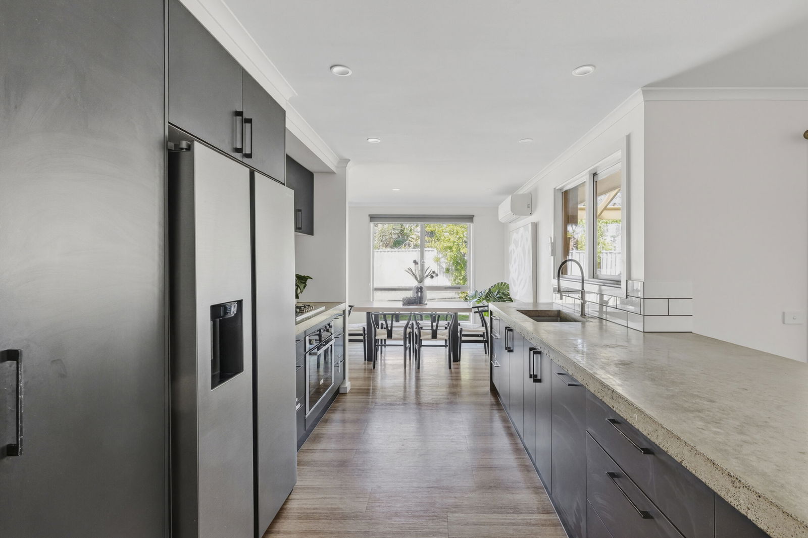 Kitchen/meals – Beautifully updated kitchen and meals area with concrete formed benchtops, modern appliances including a freestanding 600mm oven with gas cooktop, bespoke black cabinetry, window servery, engineered timber floors & reverse cycle heating/cooling