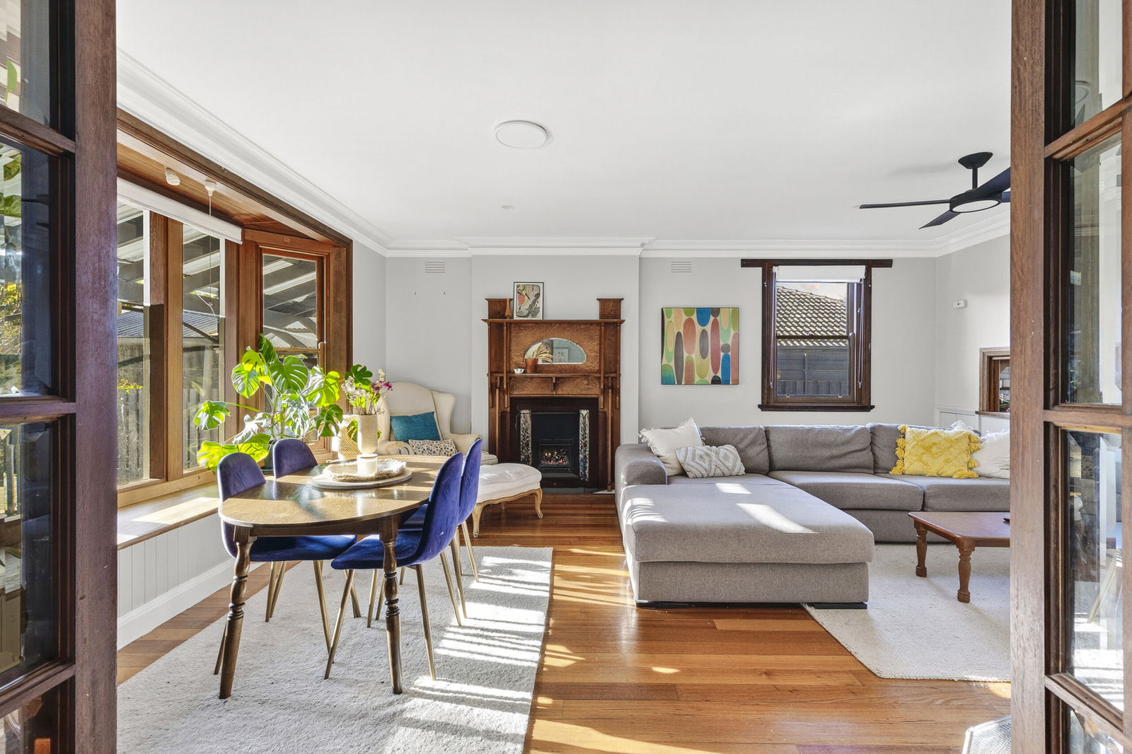 Living/Dining: Double glass door entry, polished timber floors, bay window with in-built seat, open fireplace with timber mantle, decorative cornice, ceiling fan.