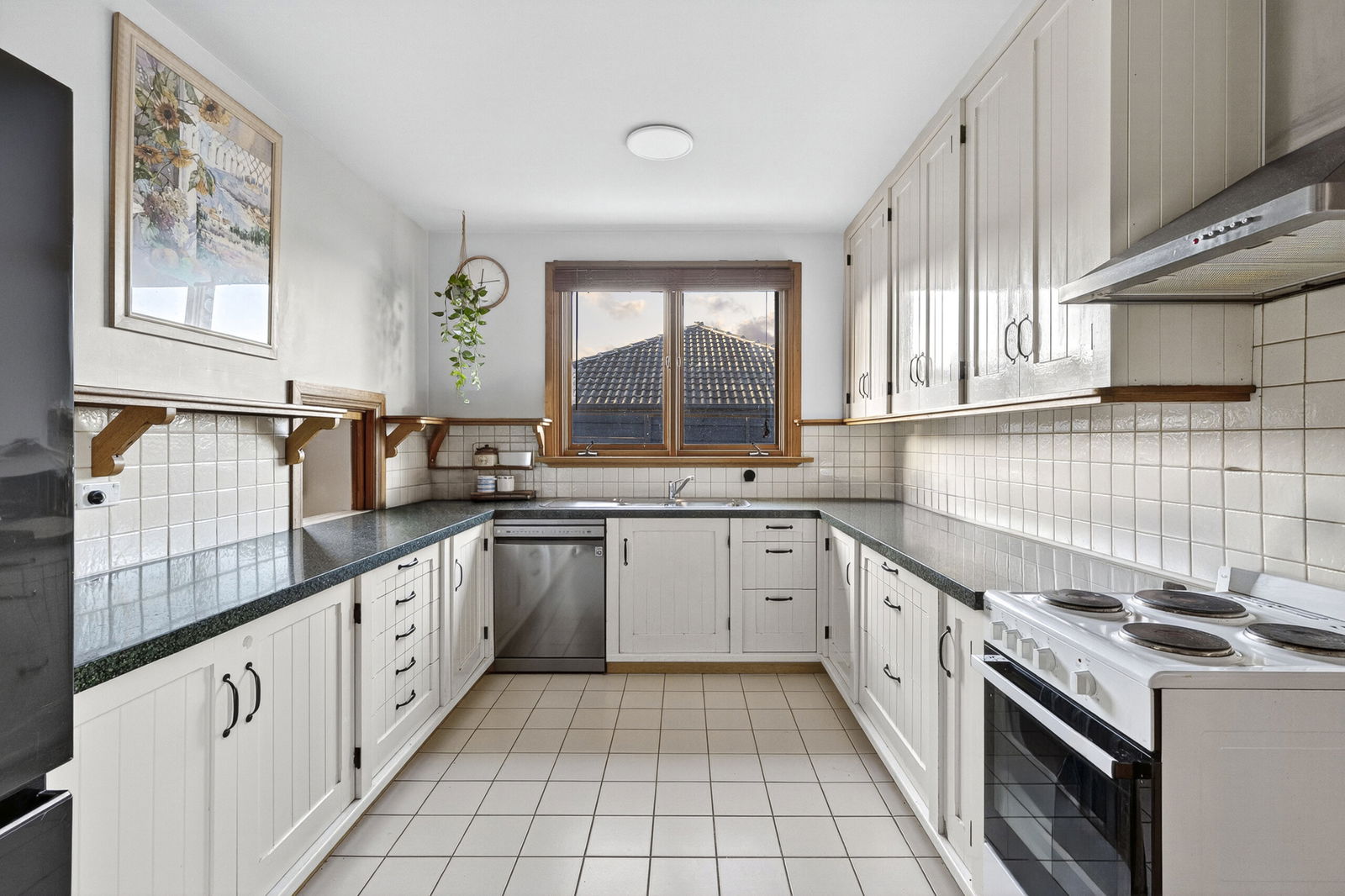 Kitchen: Combined oven and gas cooktop, dishwasher, tiled floors, ample bench space, internal servery window to living/dining space, canopy rangehood, overhead cupboards, and vertical pantry.