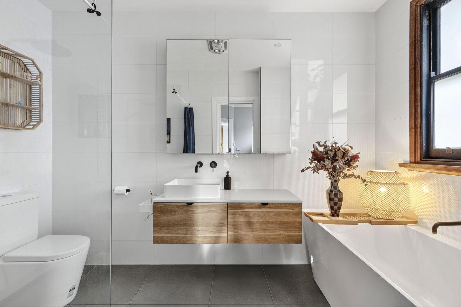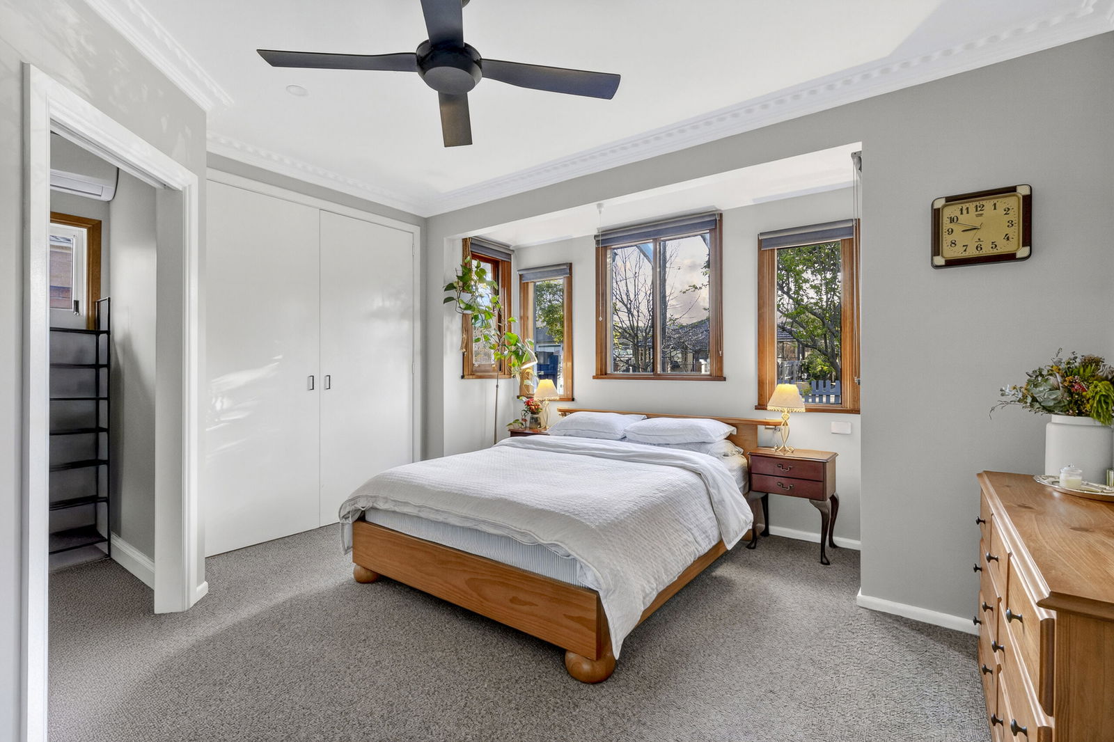 Master Suite: Carpet, built-in robe, spacious walk-in robe, ceiling fan, decorative cornice, and a renovated ensuite with feature tub, floating vanity with underbench storage, toilet, and walk-in shower with niche.