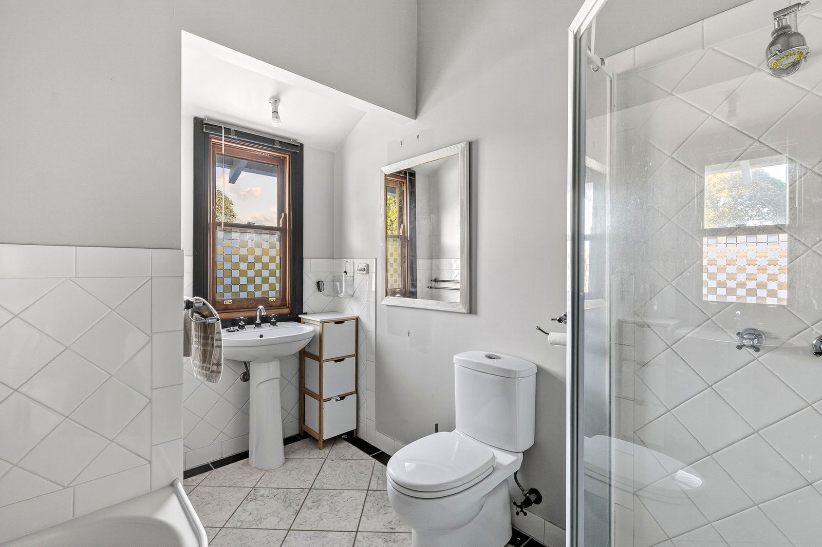 Main Bathroom: With a main bathroom servicing each floor, they both come with shower, toilet, sink, and tiled floors, while the upstairs bathroom includes a tub.