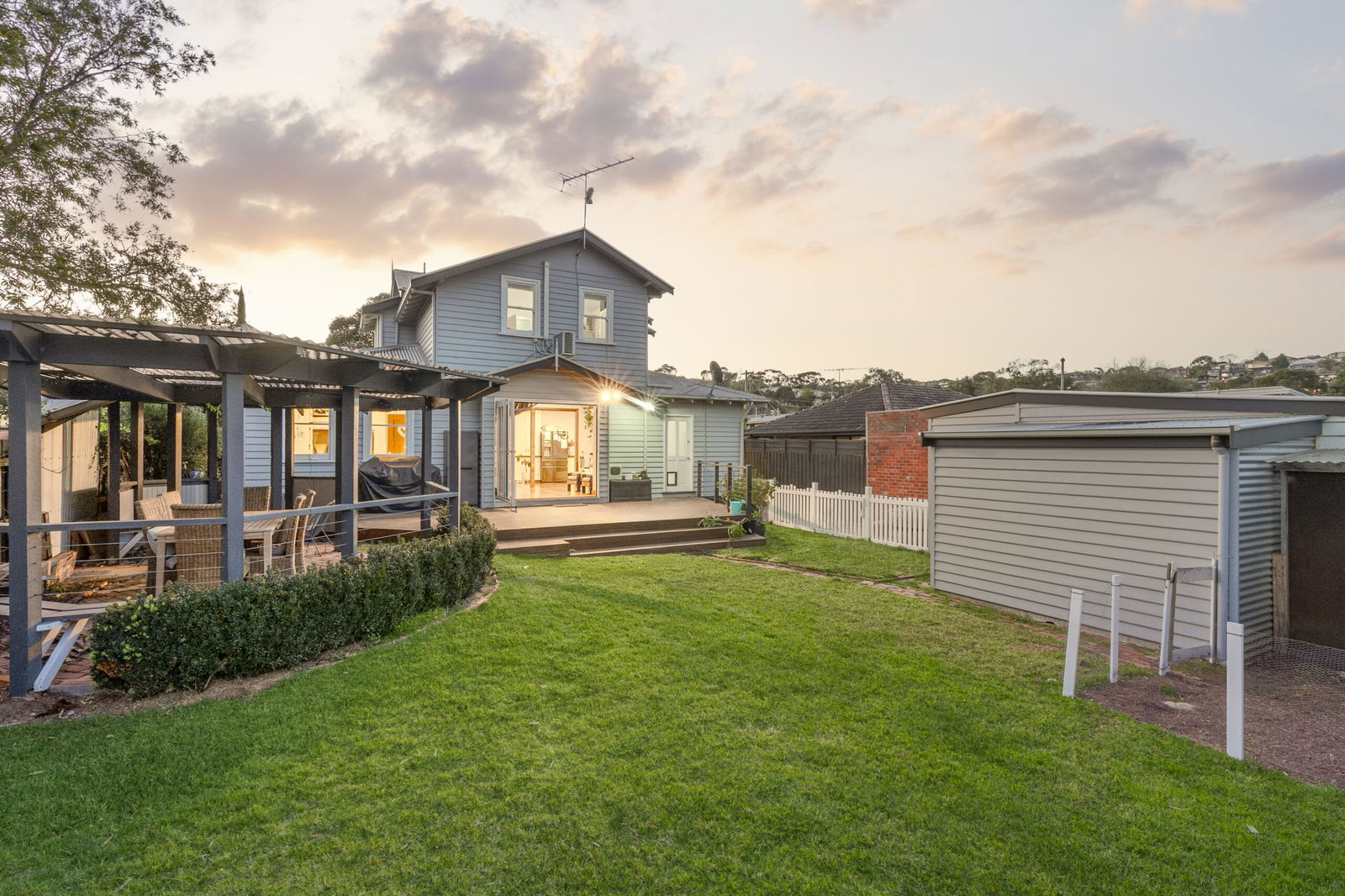 Outside: Secured by picket fencing, the front and rear yards provide a secure space for children to enjoy. To the rear, a spacious undercover entertaining space complements a sun-drenched deck, chicken coop, a drive-through single carport, and rear garage with workshop introduced via additional parking.