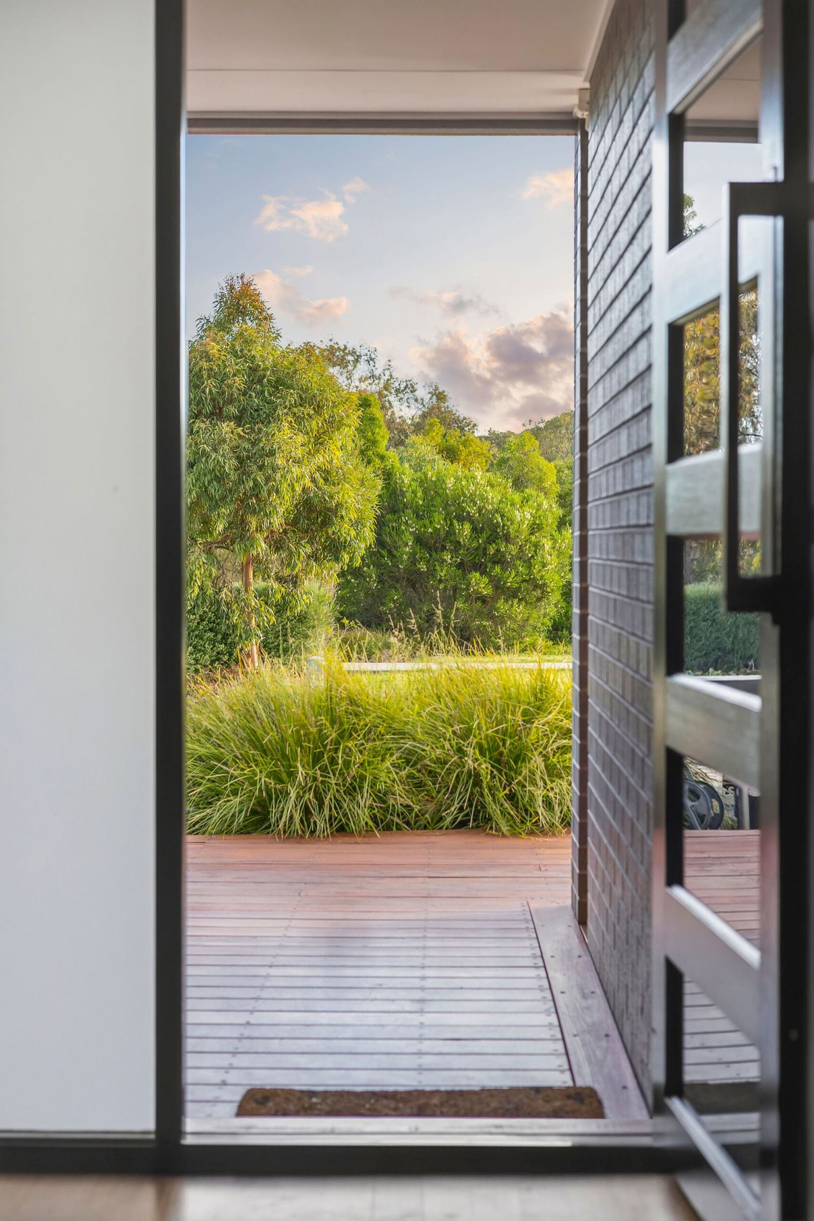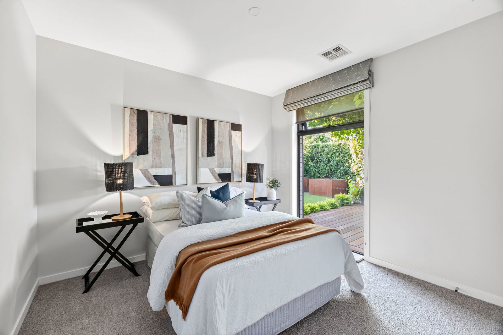 Additional Bedrooms: Three additional bedrooms, each with leafy garden aspects and two with built-in robes and carpet underfoot. The third, a secondary master bedroom with a comprehensive walk-in robe, rear deck access with automated exterior blind, and an ensuite with eye-level storage, floating vanity with underbench storage, shower with integrated shelf and rail head, and toilet.