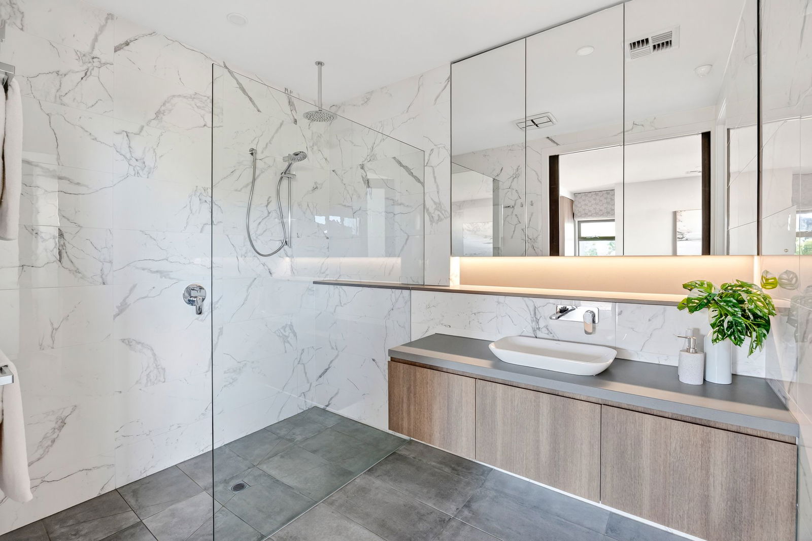 Main Bathroom: Floating vanity with underbench storage, full-height tiling, feature tub, walk-in shower with ceiling-mounted and rail head, and separate toilet.