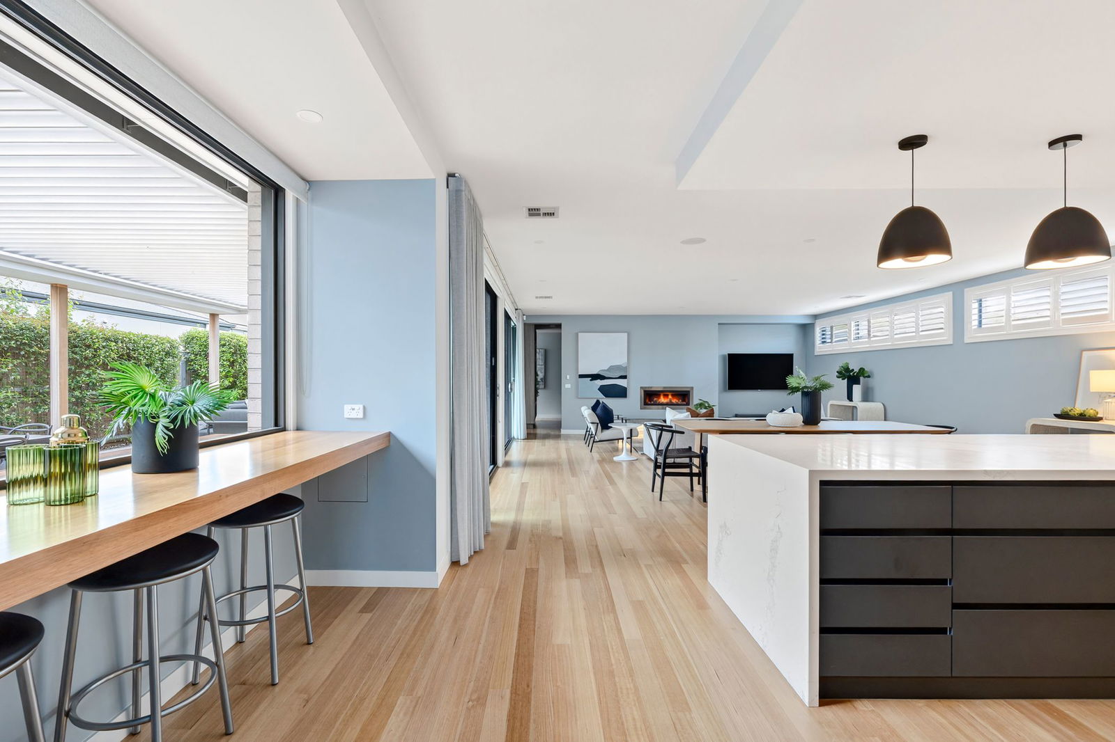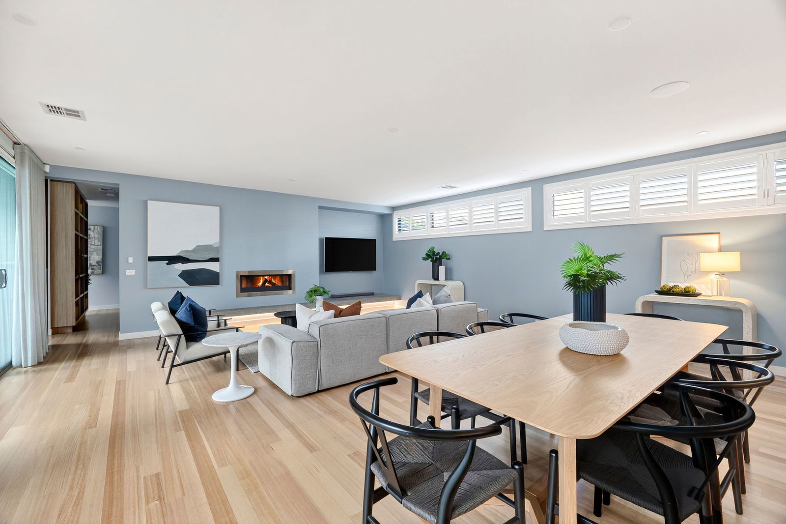 Open Plan Living/Dining: Solid timber floors, highlight window with plantation shutters, Heat & Glo fireplace, floating concrete bench with feature lighting, and expansive twin stacker doors to alfresco with roller blinds and sheer curtains.