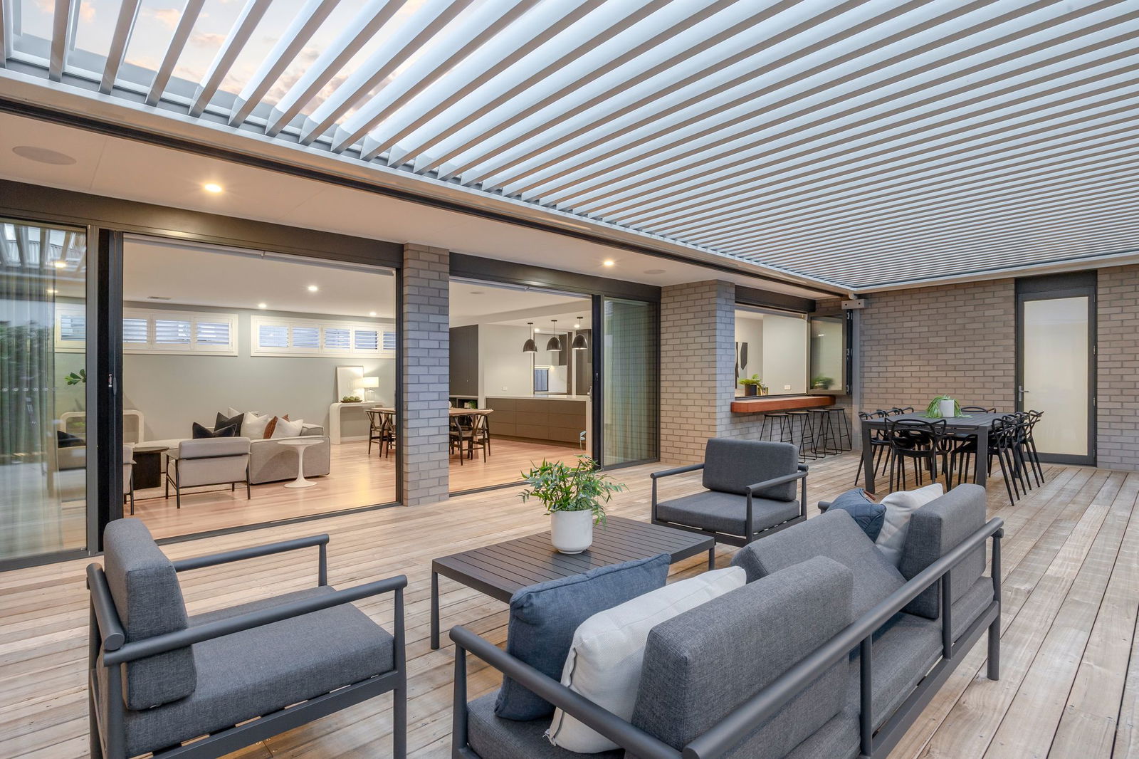 Outside: A spacious alfresco deck with automated louvre roof extends entertaining outside, with an established hedge-lined pathway opening to a rear yard with secondary deck and raised planter boxes.