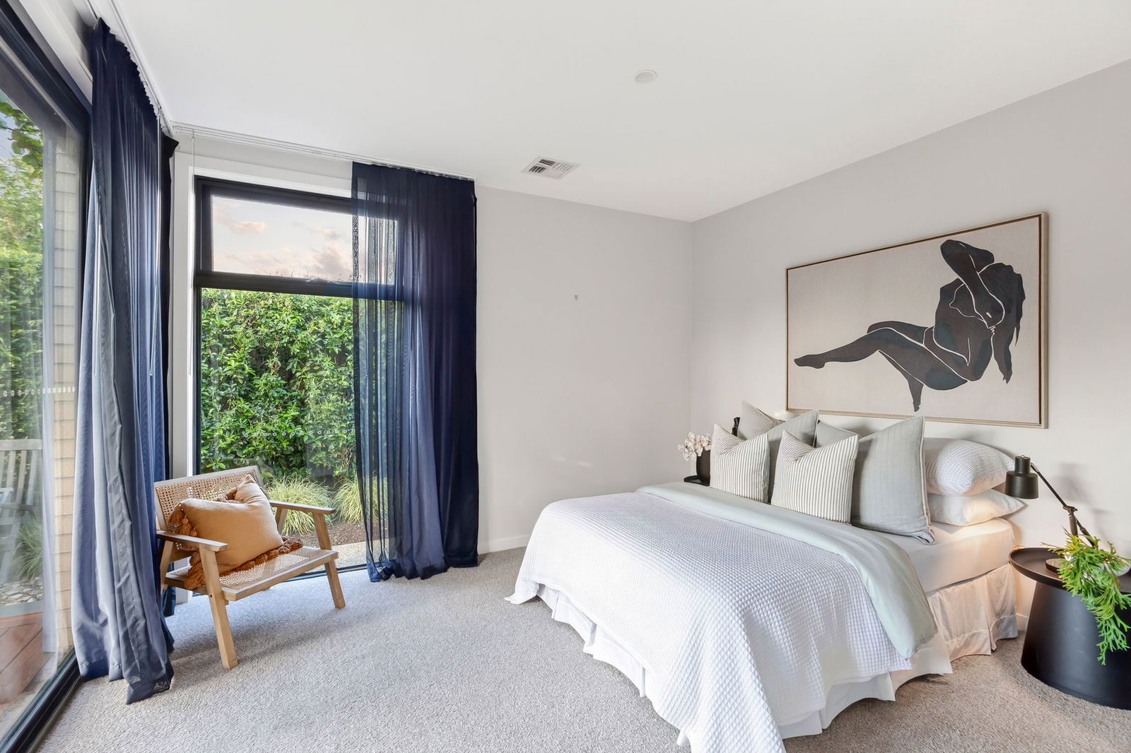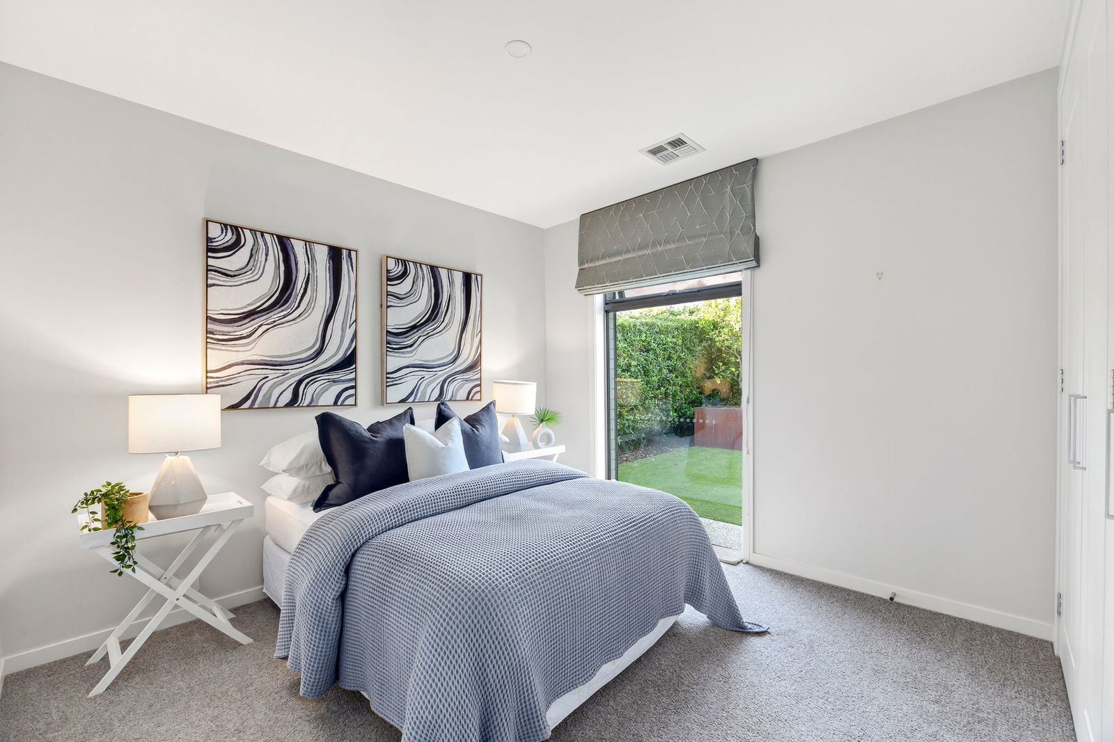 Secondary Living: Carpet underfoot, built-in entertainment area with bespoke cabinetry, integrated shelving, highlight window with plantation shutter, and expansive sliding door with custom window furnishings.