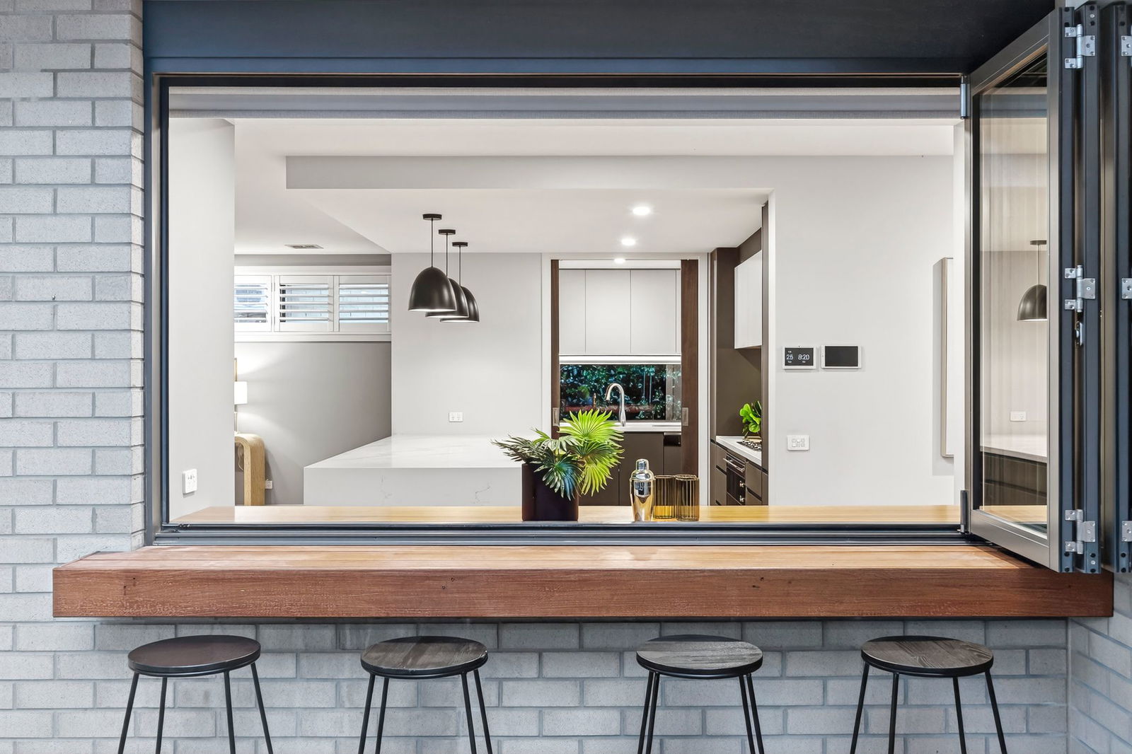 Kitchen: Expansive stone-topped peninsula with breakfast bar overhang, 900mm Smeg cooking appliances, feature pendant lighting, downlights, and stone splashback. Butler’s pantry with window splashback, microwave cavity, Miele integrated dishwasher, fridge cavity, and dual sink. Two-way bar seating with bi-fold servery window to decking, and separate bar nook with drinks fridge.