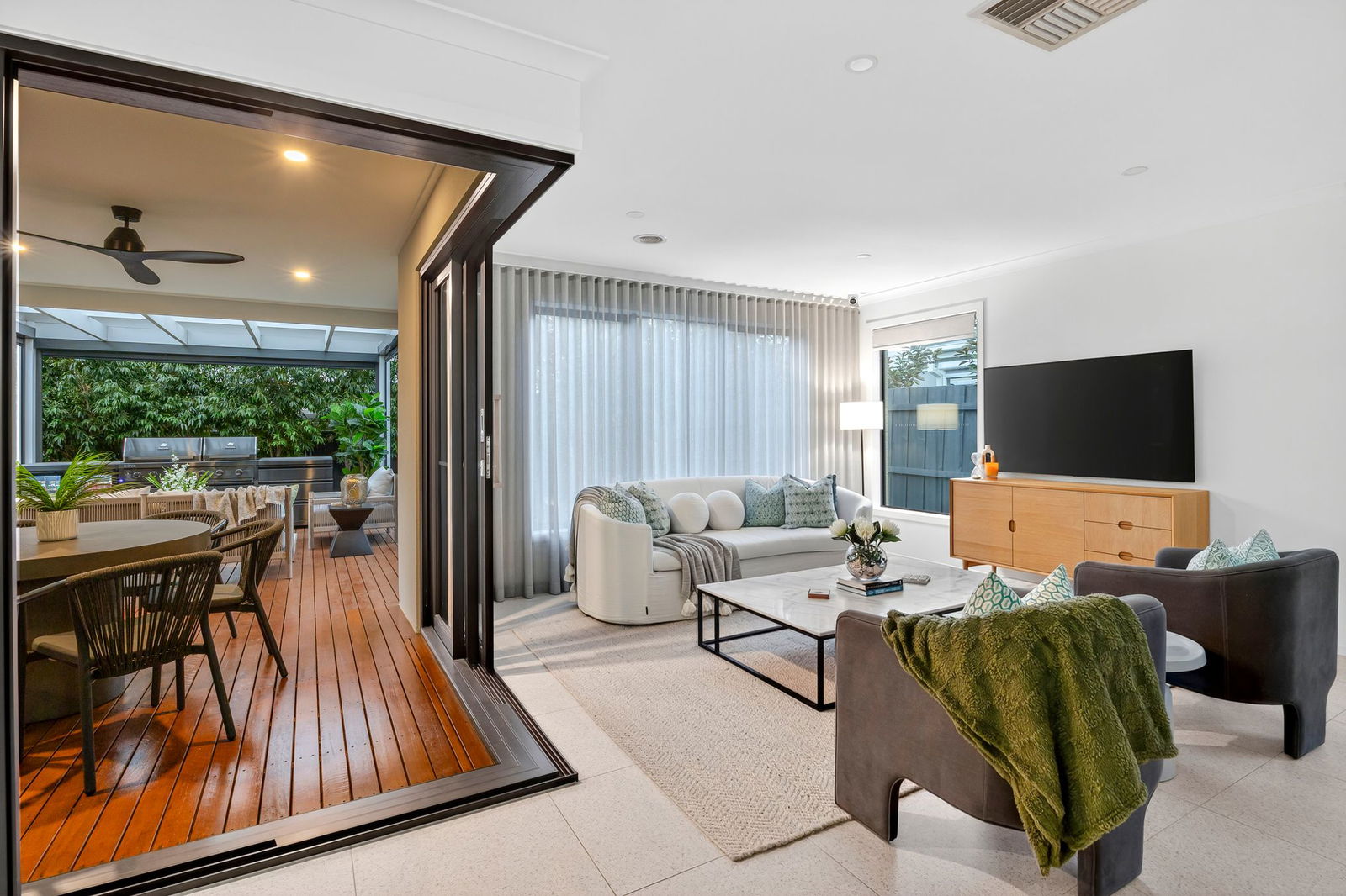 Living/Dining: Tiled floors, large rear-facing windows with full-height sheer curtains, corner-opening glass sliders to deck alfresco, built-in speakers, downlights, and feature dining pendant.