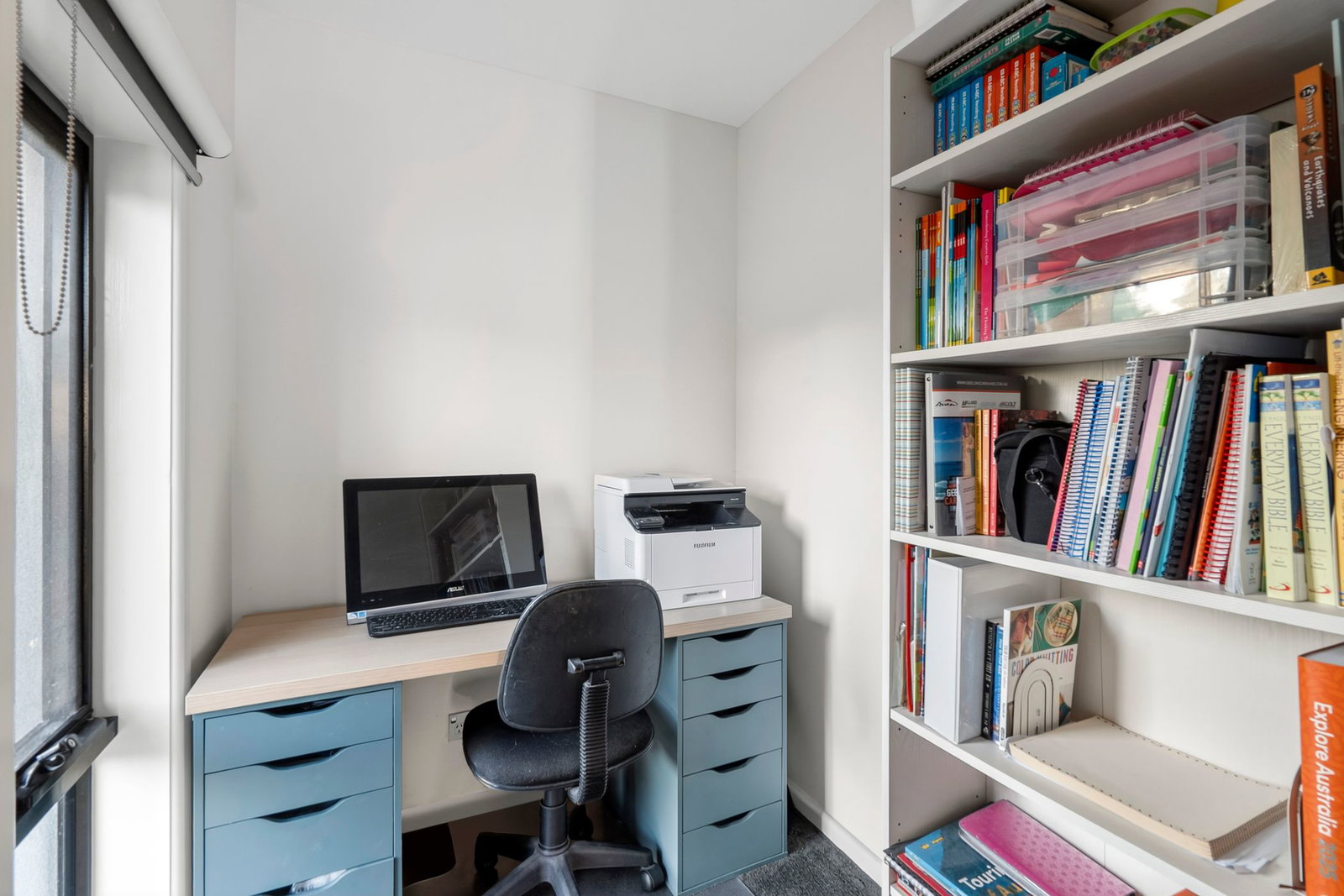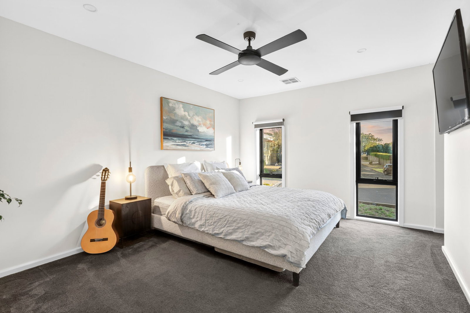 Master Suite: Spacious with barn door entry, carpeted, street-facing windows with roller blinds. Ceiling fan, open study space, built-in and walk-in robes. Ensuite with twin shower, floating vanity, full-height tiling, privacy glass, and toilet.