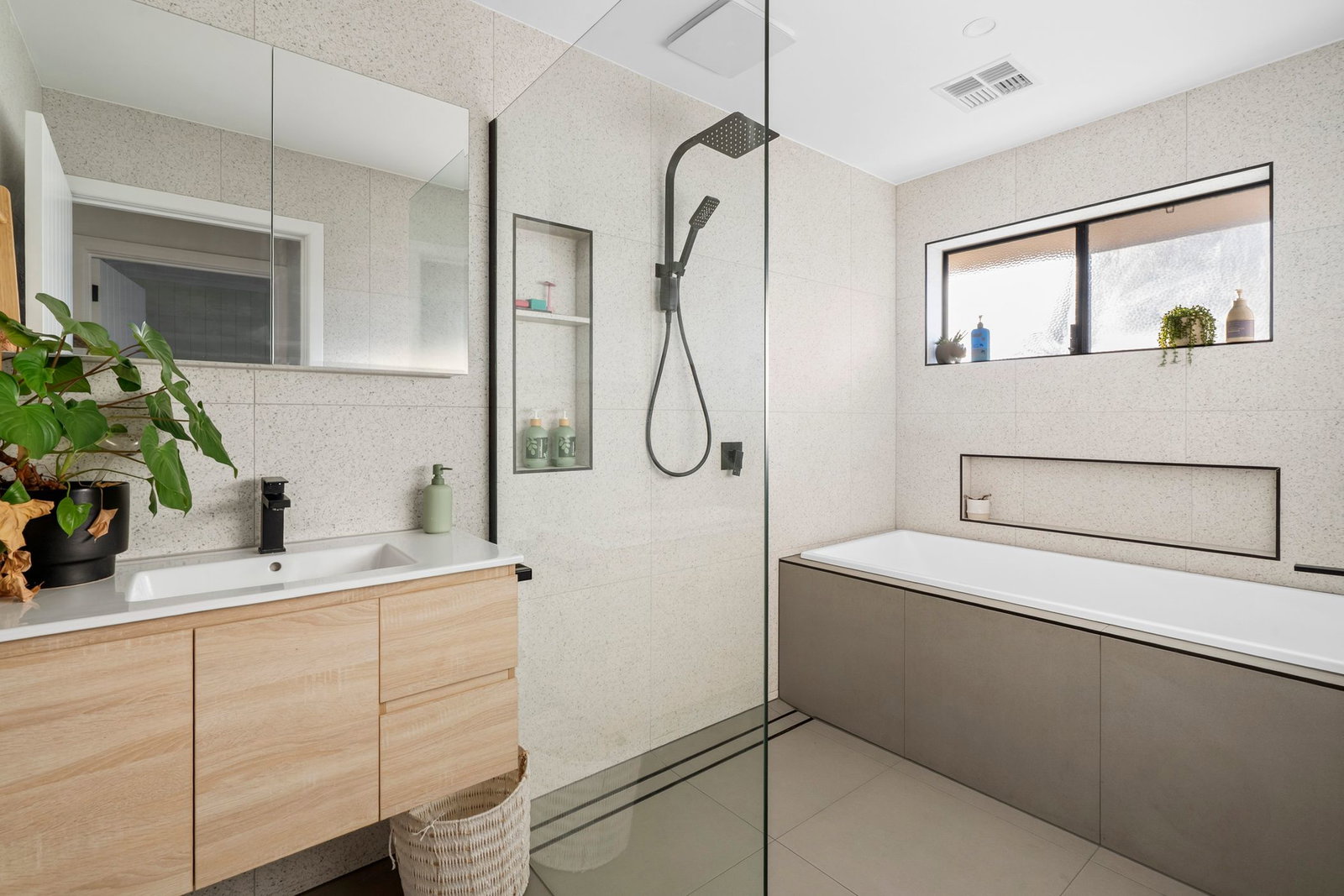 Main Bathroom: Walk-in shower, bathtub with tiled surround, two built-in tiled niches, floating vanity with mirror storage, full-height tiling, and privacy-glass window.