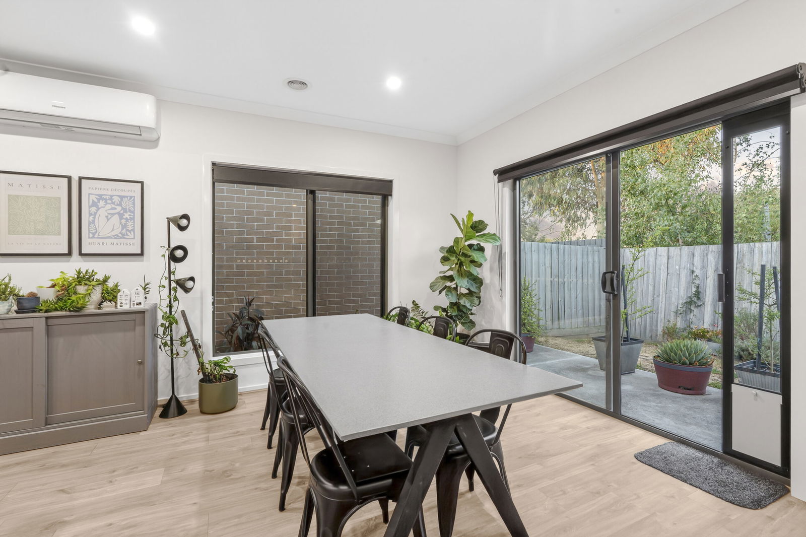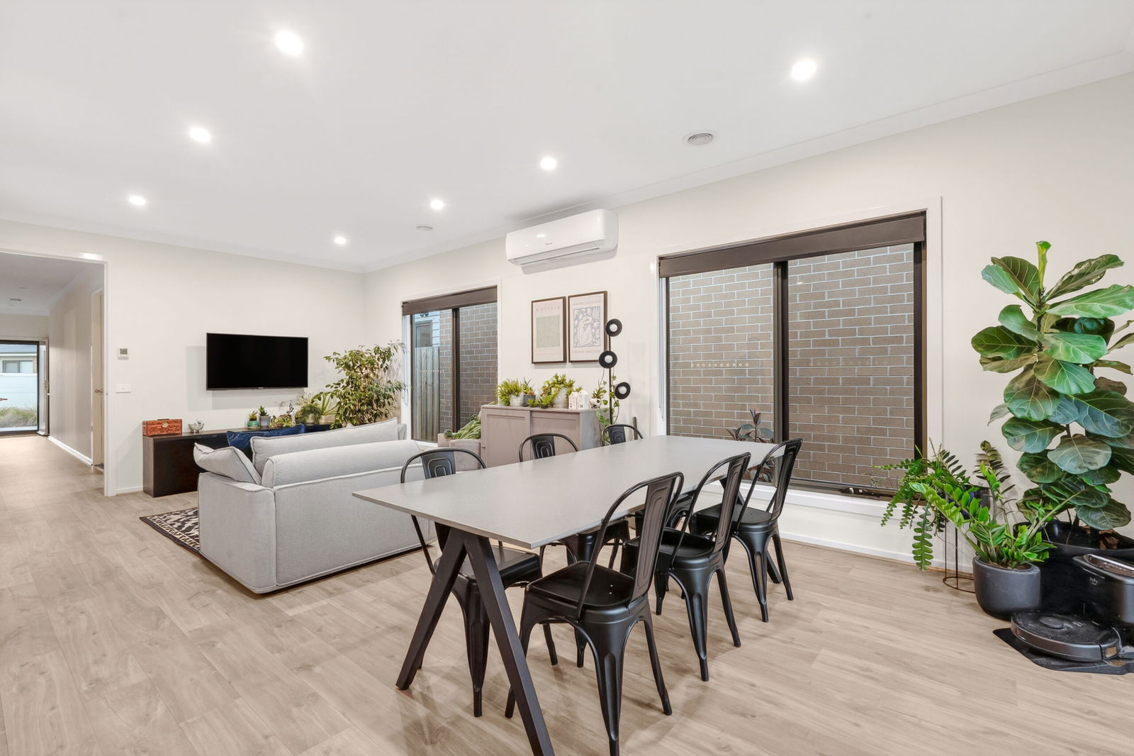 Open Plan Living/Dining: Practical space for everyday living and entertaining, anchored by modern hard-wearing floors. A glass sliding door opens to a sun-kissed patio and low-maintenance garden, while twin windows with roller blinds, a split-system air conditioning unit, and downlights finish the space.