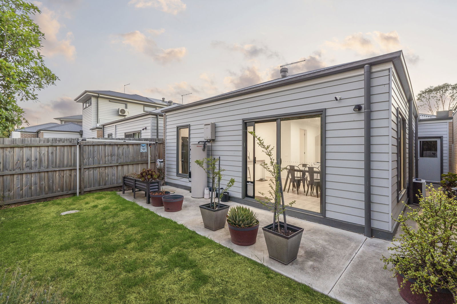 Outside: A north-eastern facing rear yard demands little-to-no maintenance, as a secure grassy space. Perfect for small pets or young grandchildren, with a clothesline, and a concrete pathway that extends to rear garage access. At the front, a triple-fronted facade ensures a striking street presence, highlighting the home’s ‘lock-and-leave’ convenience.