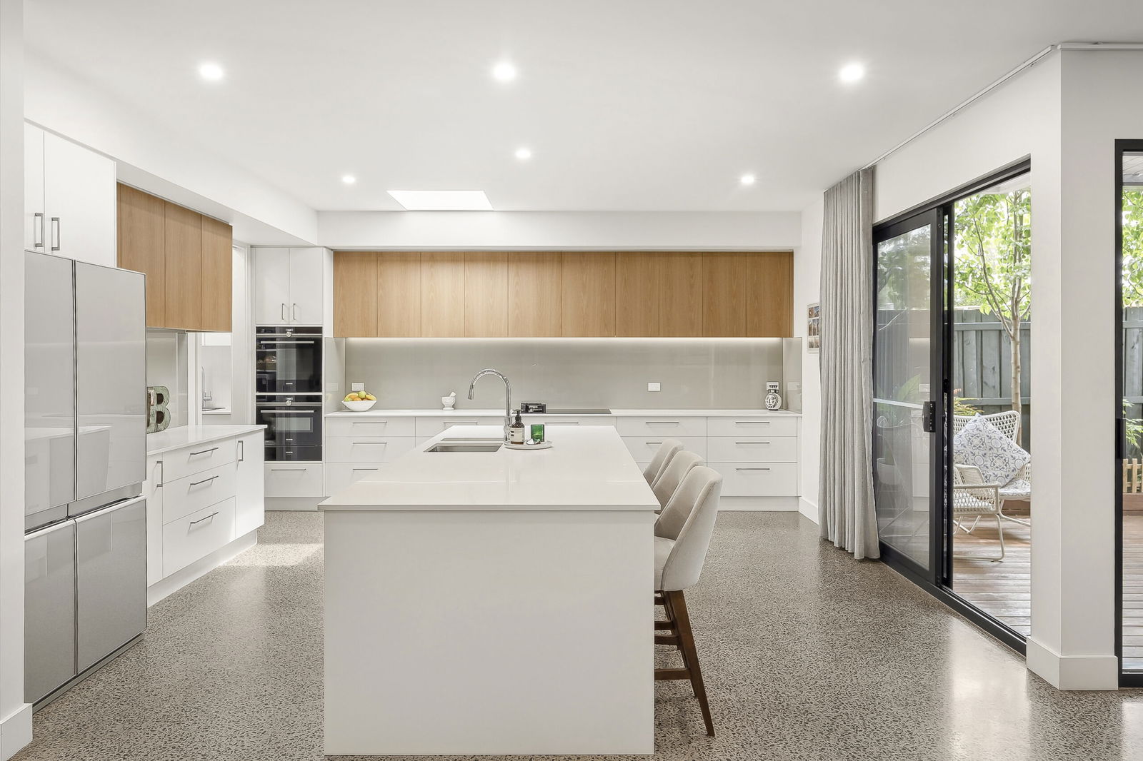 Polished concrete floors and crisp square-set ceilings lend a refined edge to the open-plan living zone, while expansive glazing draws in natural light and frames leafy outlooks. The connection between the living area, alfresco deck, and courtyard garden inspires effortless entertaining and weekend relaxation.