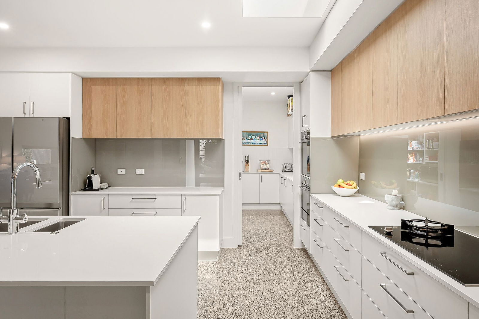 Kitchen: Stone benchtops, timber cabinetry, Siemens oven, microwave oven, and warming drawer, induction cooktop with gas wok burner, Asko dishwasher, Zip tap, butler’s pantry, oversized island bench, and LED lighting.