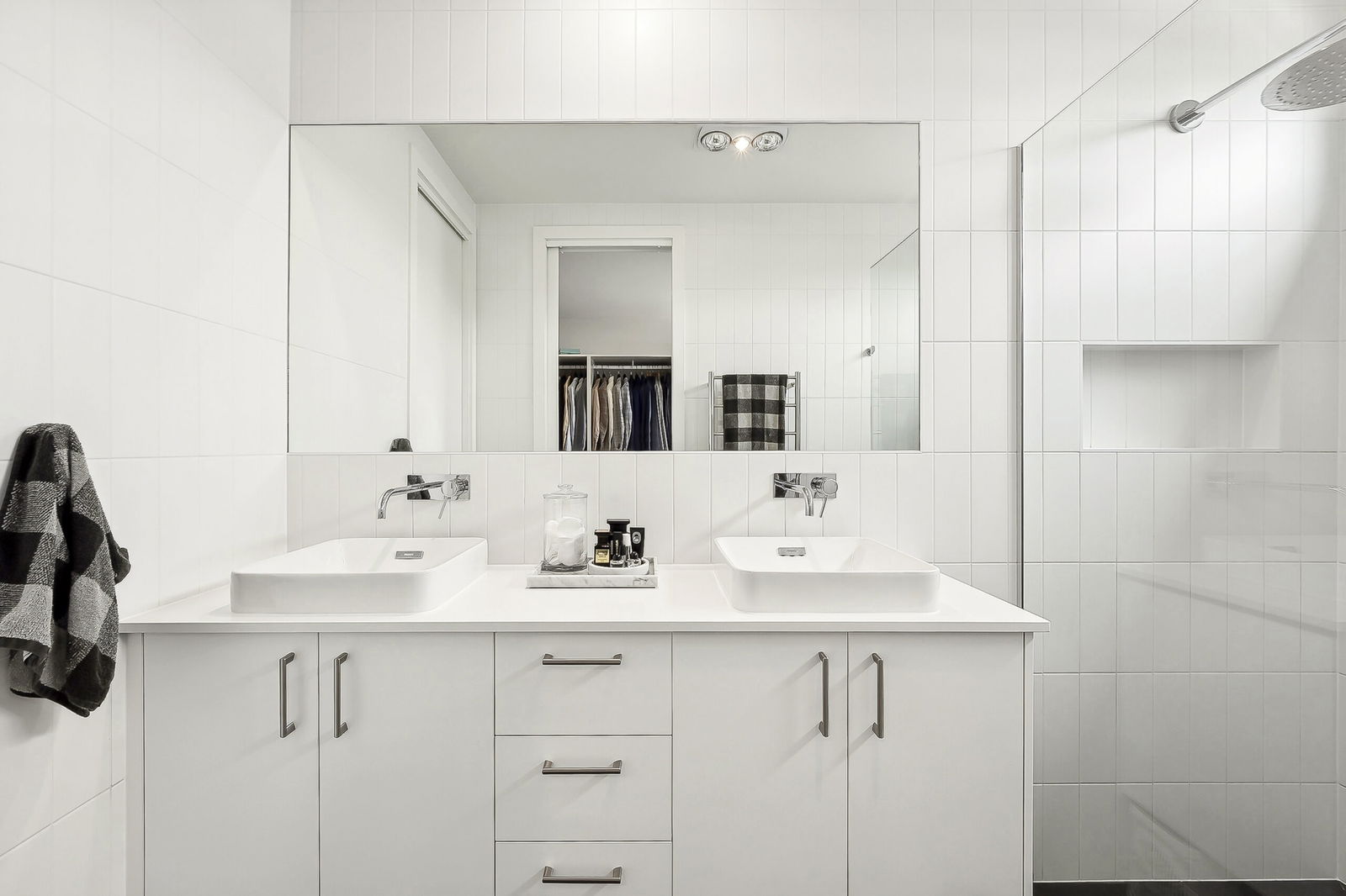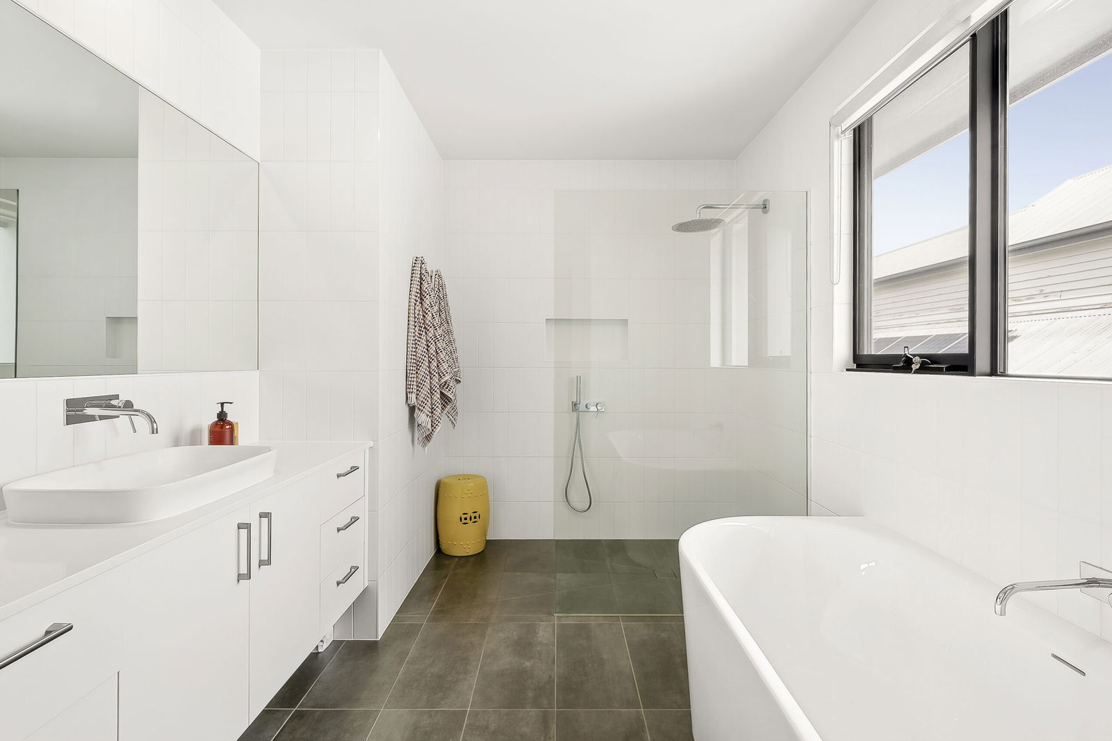 Additional Bedrooms: Three additional bedrooms, two with walk-in robes and one with built-in robes, all sharing a central bathroom with freestanding bathtub, rain shower, and stone finishes.
