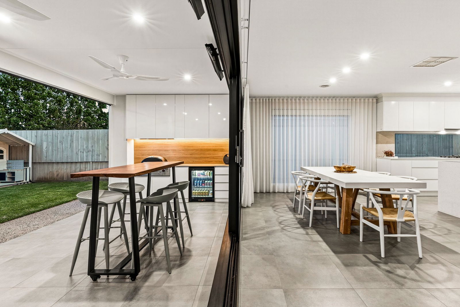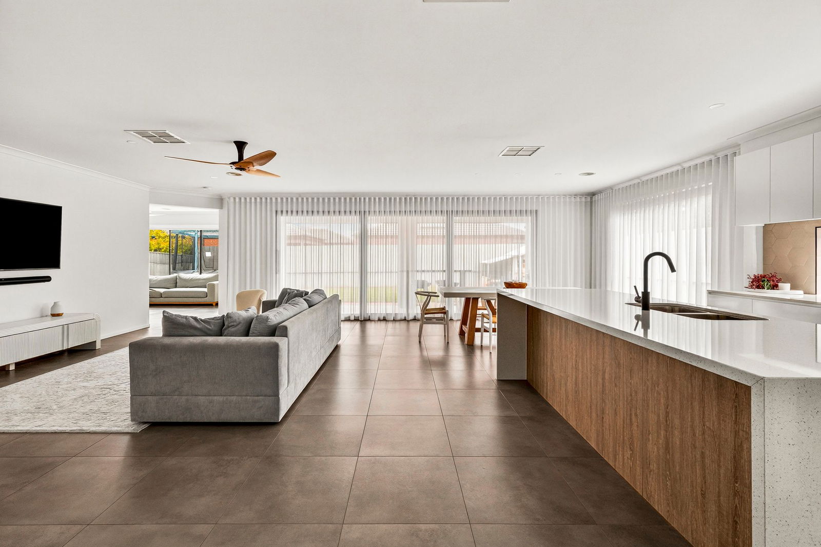 Living/Dining: Tiled floors, ceiling fan, large window bays with stacker door access to alfresco, full-height custom sheer curtains, and downlights.