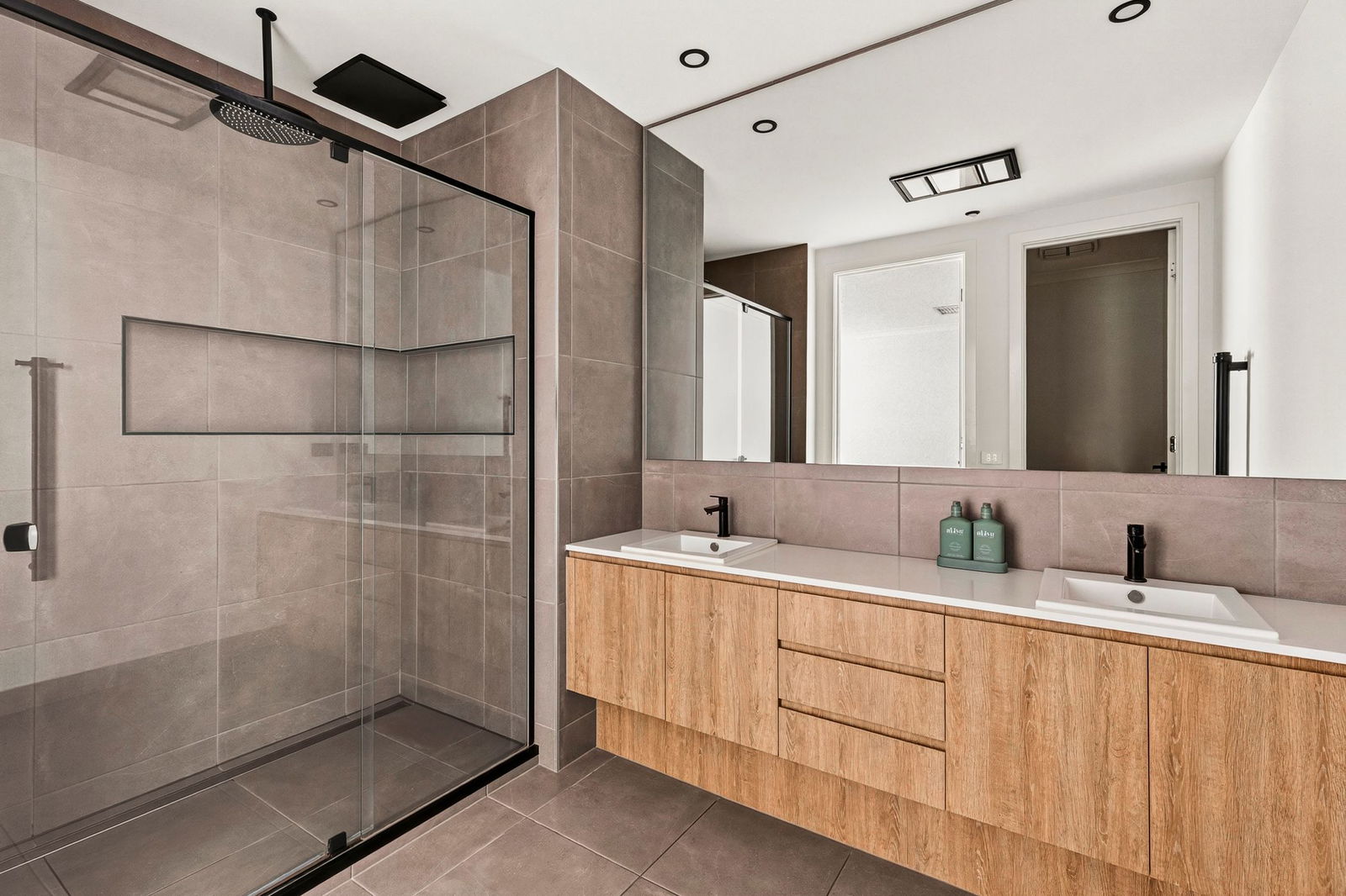 Master Suite: Double door entry, large window with roller blind and full-height sheer curtain, ceiling fan, downlights, and walk-in robe with plantation shutters. Spacious ensuite with stone-topped dual vanity with underbench storage, large wall mirror, black matte tapware, oversized shower with ceiling-mounted head and wall niche, vertical heated towel bar, and private toilet.